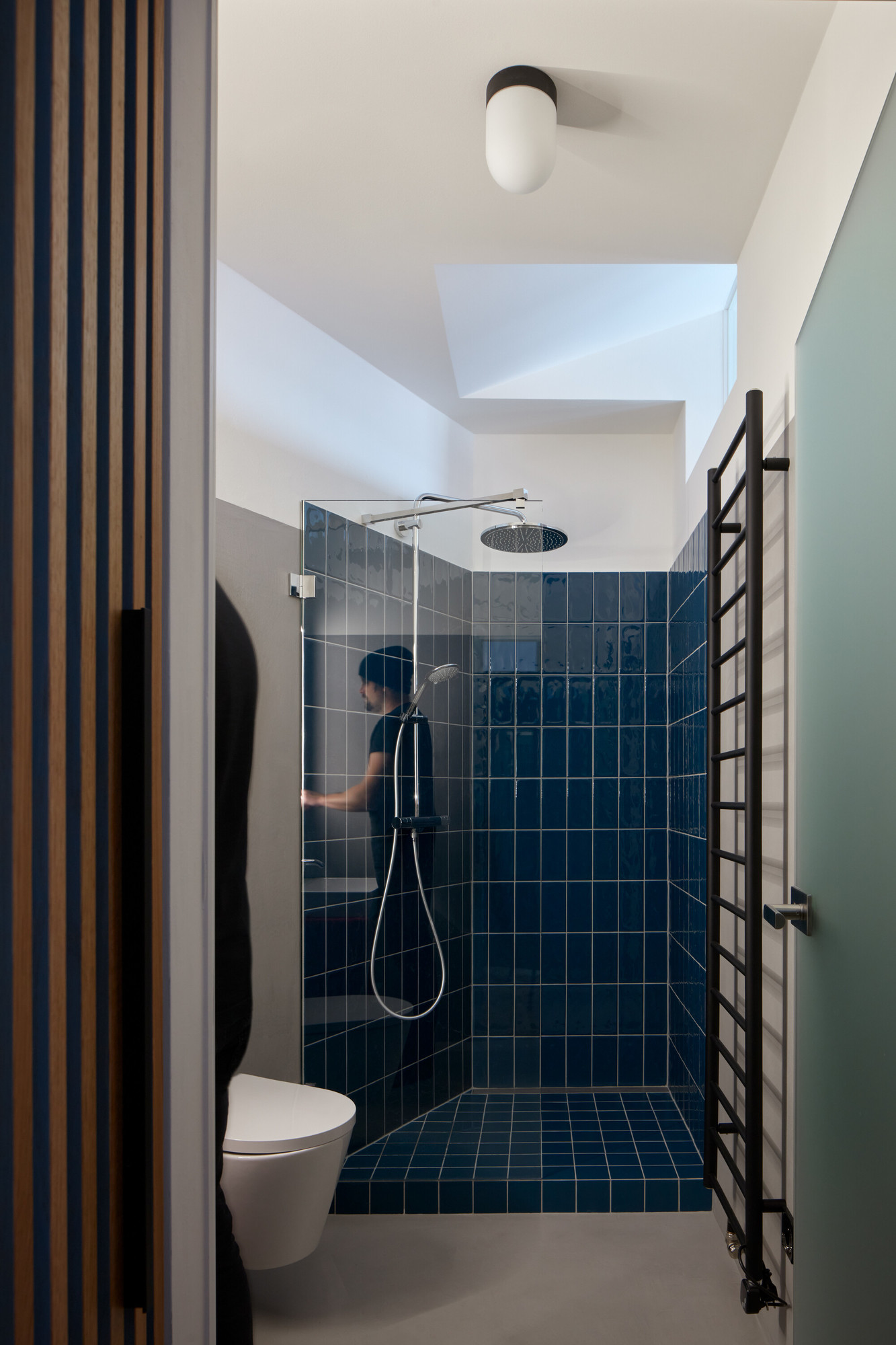 La pièce baigne dans un bleu océan grâce aux carreaux en céramique qui habillent les murs de la douche.