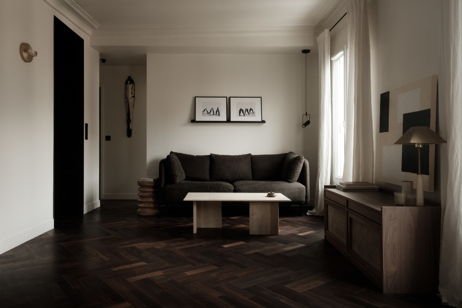 Ici, l’espace a été repensé pour offrir à la pièce à vivre une belle superficie. Le parquet en chêne fumé et les murs peints en blanc légèrement crème créent une ambiance enveloppante et chaleureuse.