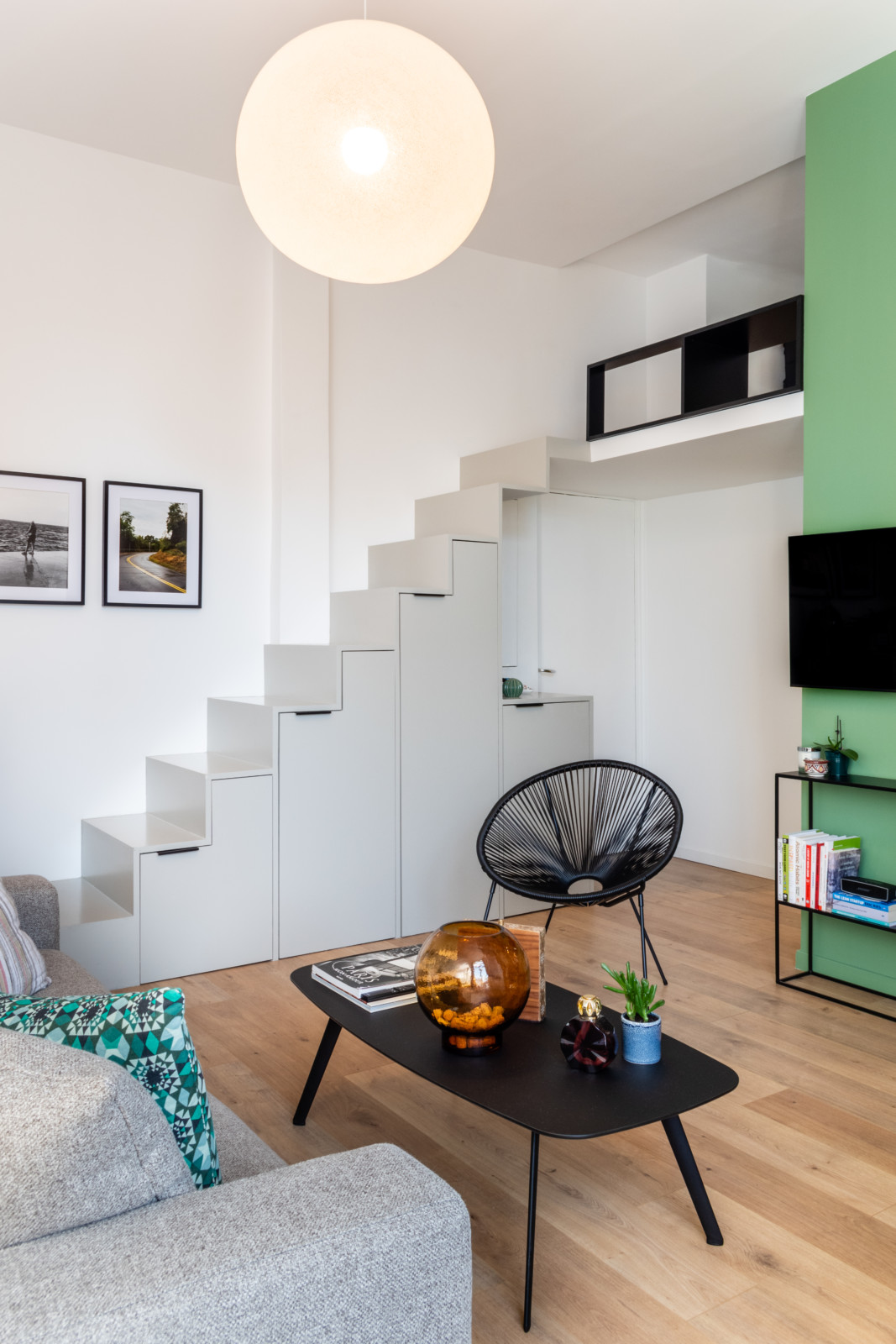 Depuis le canapé, on a également une vue directe sur l’escalier sur-mesure qui mène à la mezzanine. Pour lui donner une fonction supplémentaire, des placards ont été installés sous les marches.