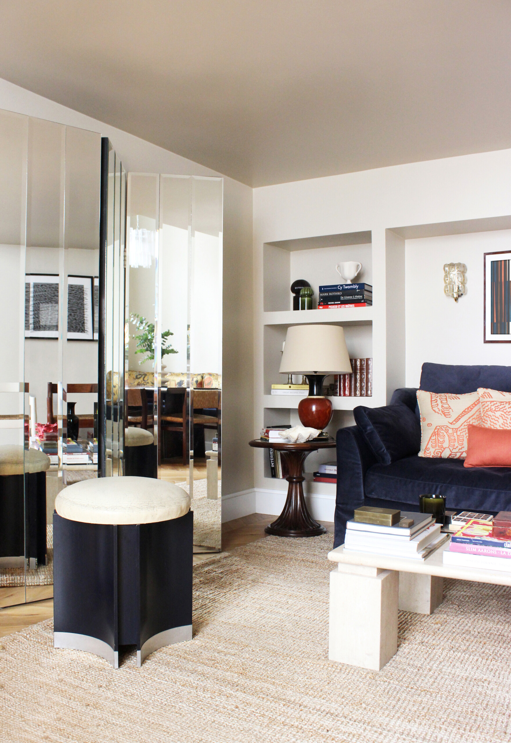 Dans le salon, un paravent en miroir diffracte les contours de la pièce et diffuse la luminosité ambiante.