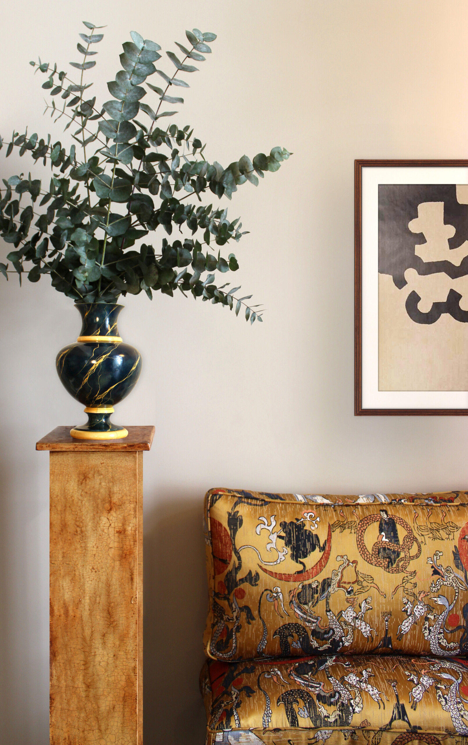 Avec son vase antique et sa banquette en soie, la salle à manger prend des airs d’hôtel particulier !
