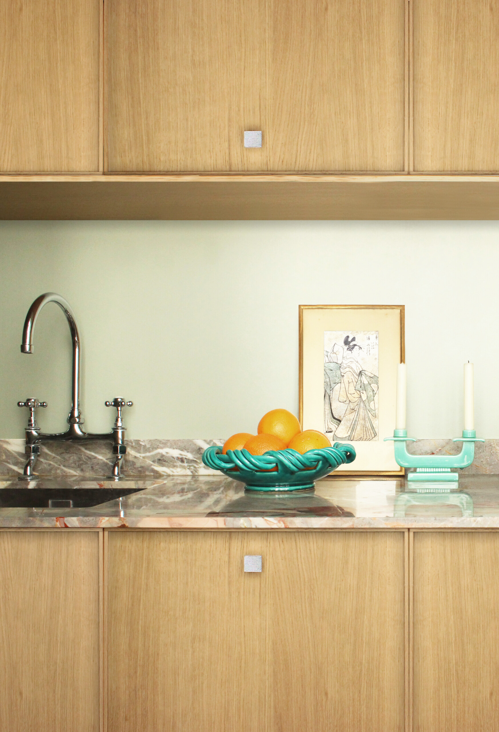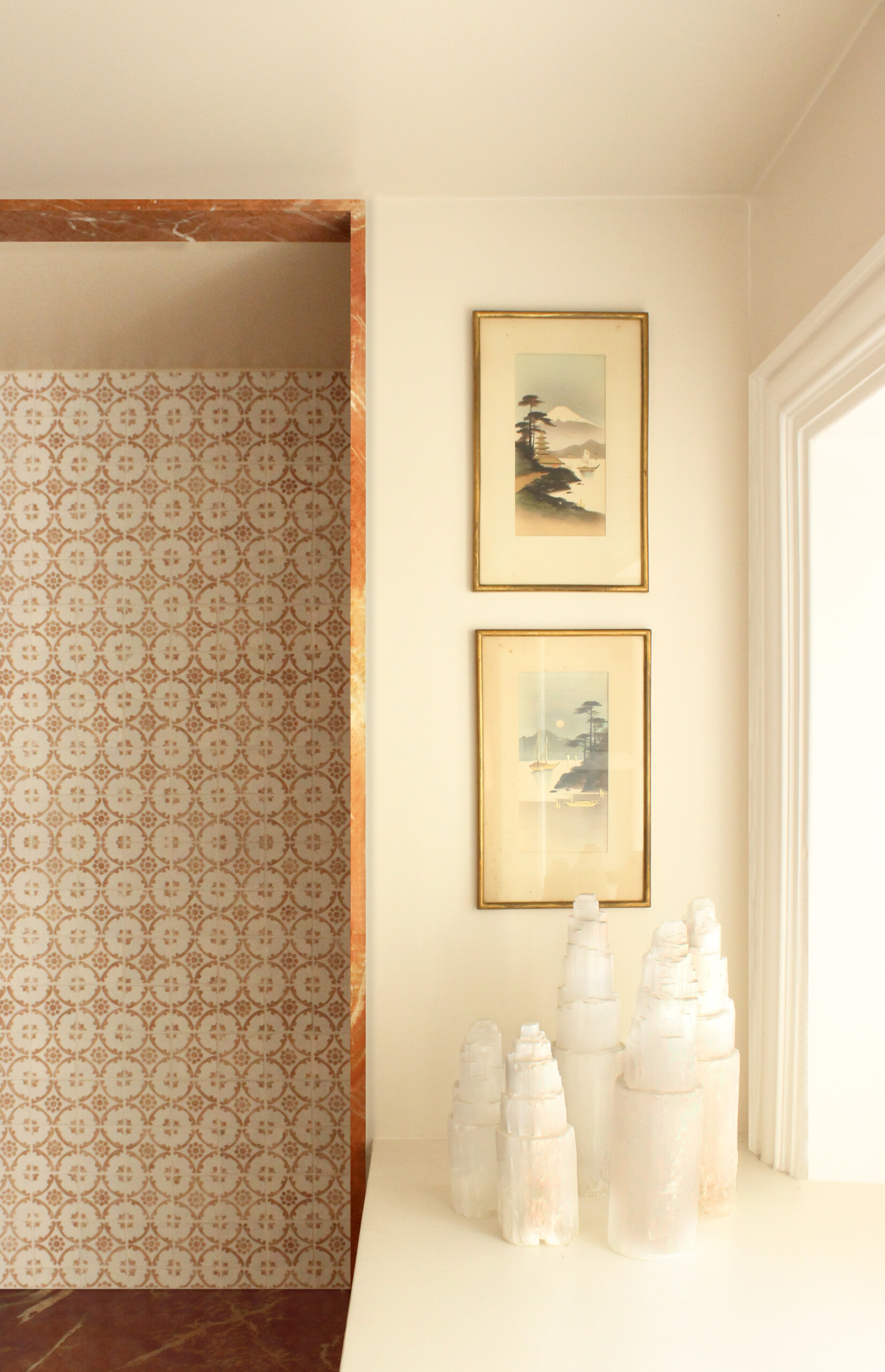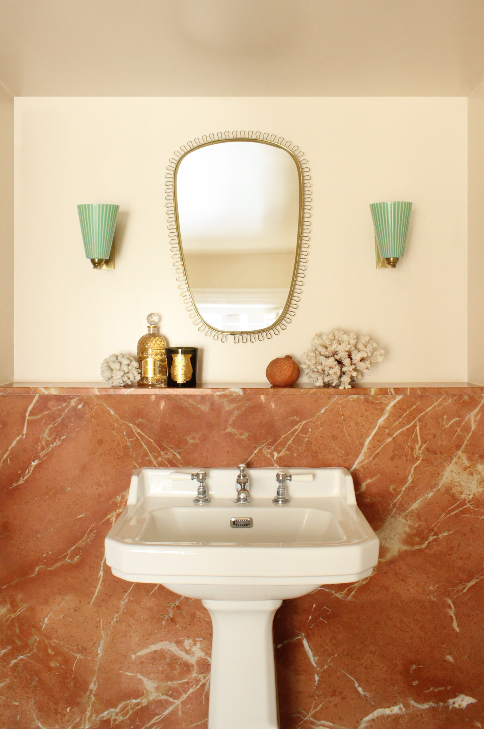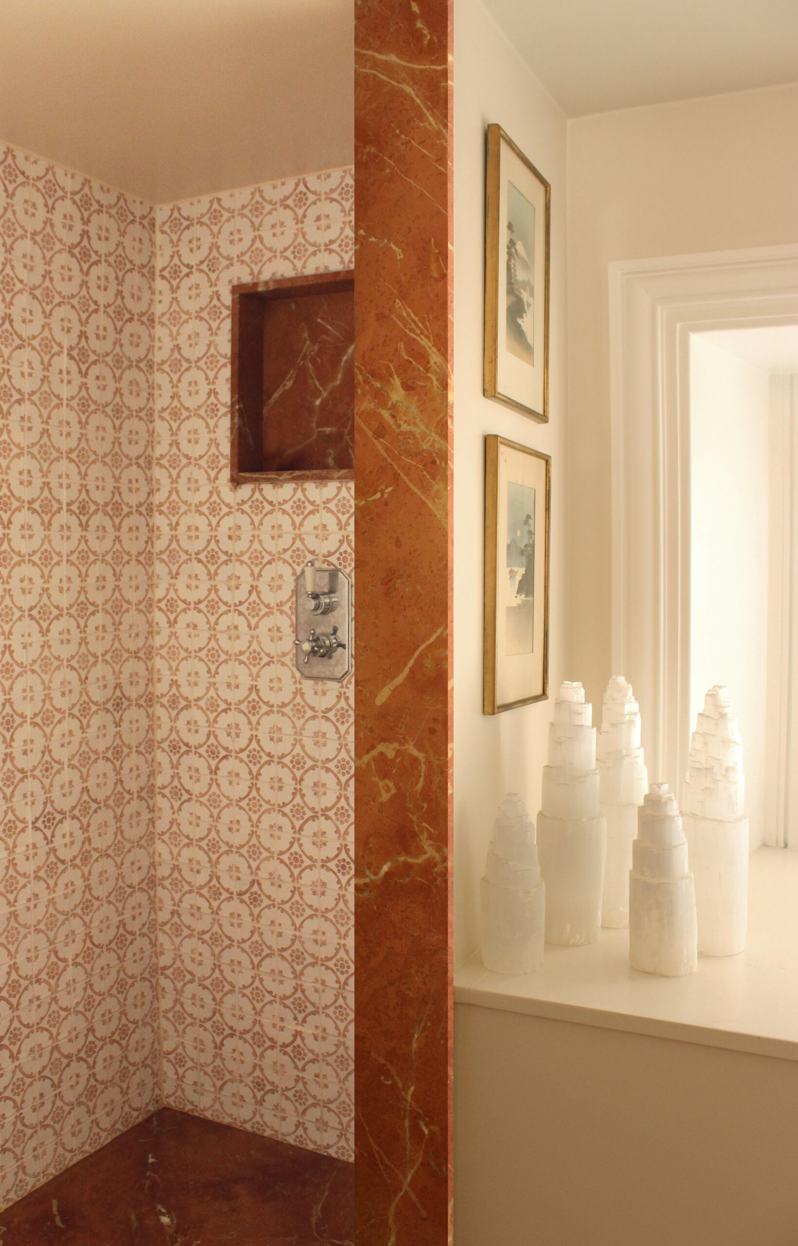Dans la salle d’eau, un lavabo sur pied jaillit d’un marbre rouge Alicante dont les nuances rappellent le plan de travail de la cuisine. La boucle est bouclée !