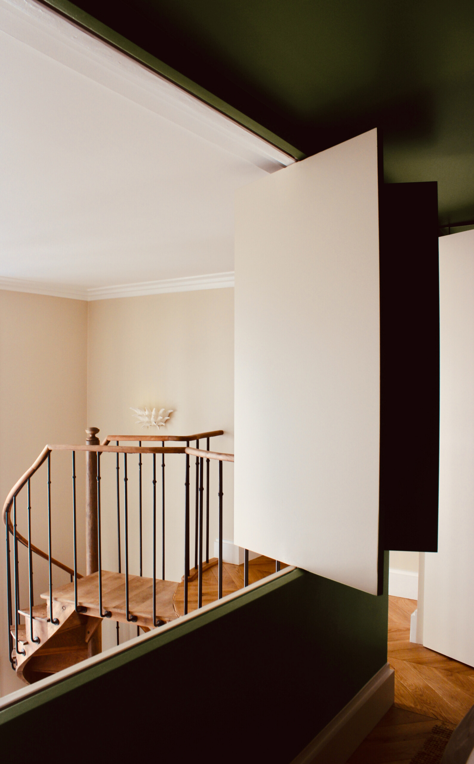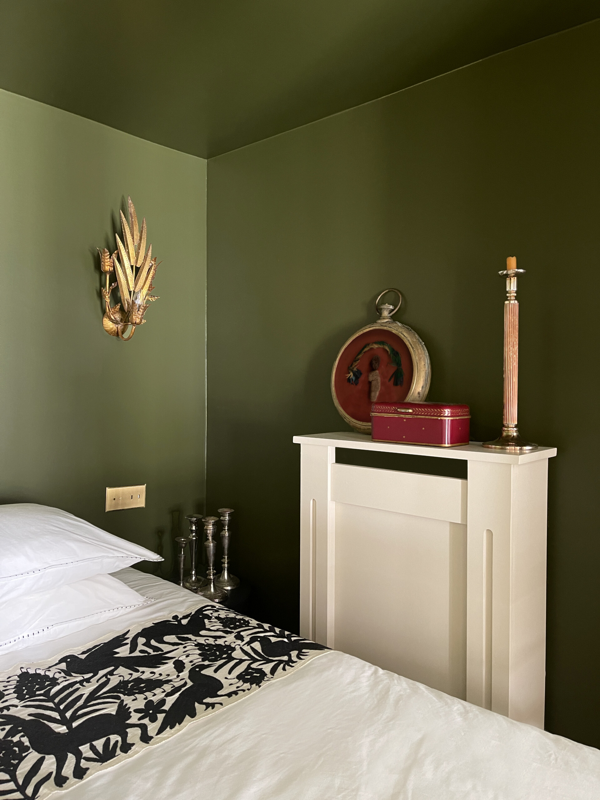 Dans la chambre, un vert olive appliqué en effet boîte assure une atmosphère confinée.