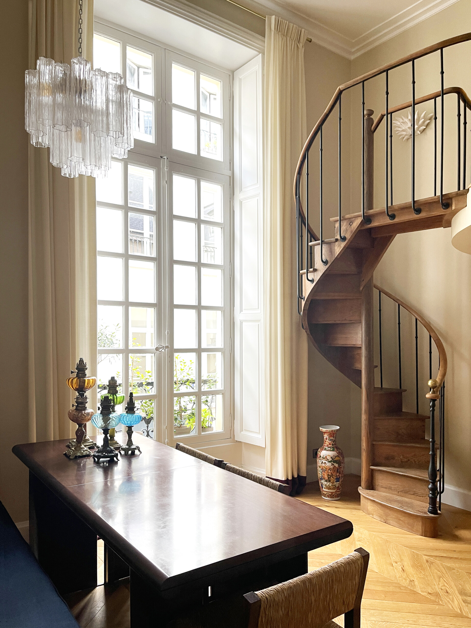Elle bénéficie d’un point de vue exceptionnel, grâce à une double porte vitrée toute hauteur éclairant un somptueux escalier en colimaçon.