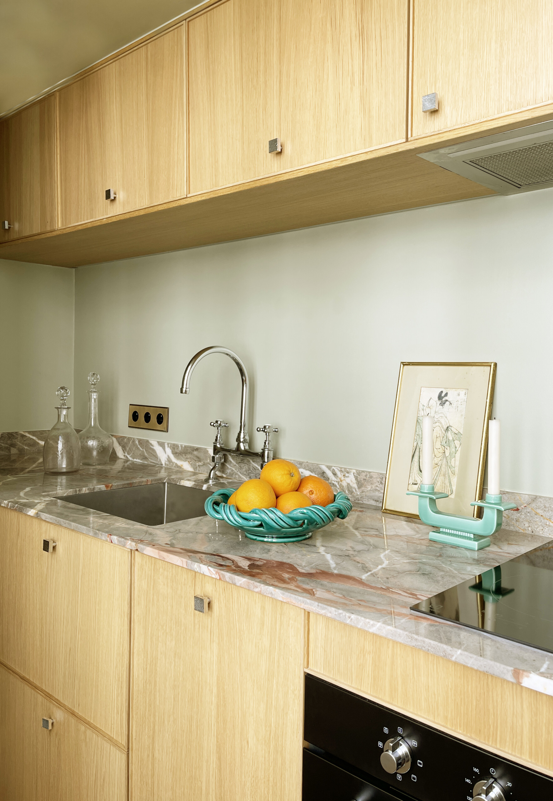 La robinetterie rétro et le plan de travail marbré contrebalancent cette tendance pour faire honneur aux origines de l’immeuble.