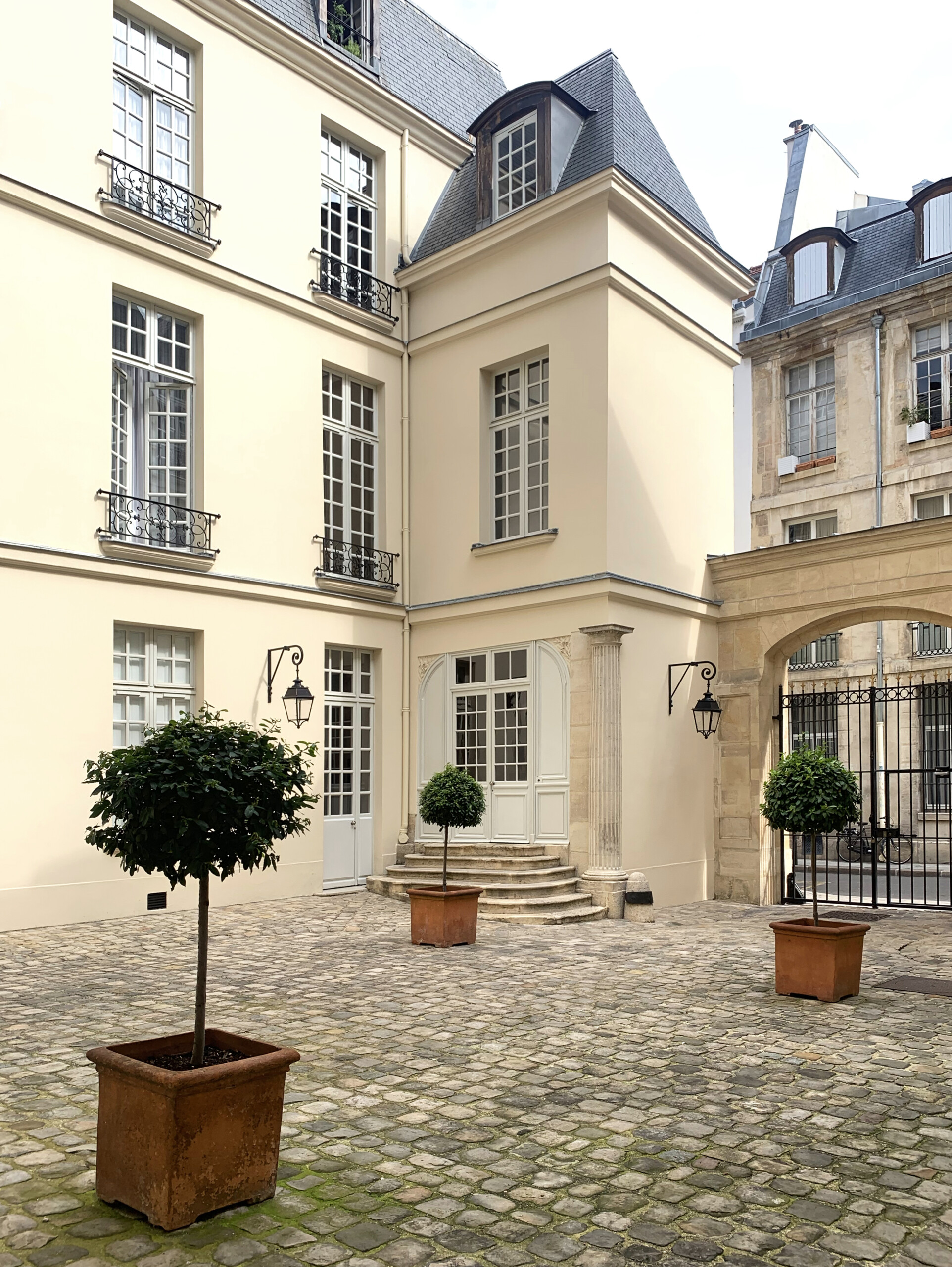On accède par une cour pavée à l’immeuble, magnifiquement restauré.