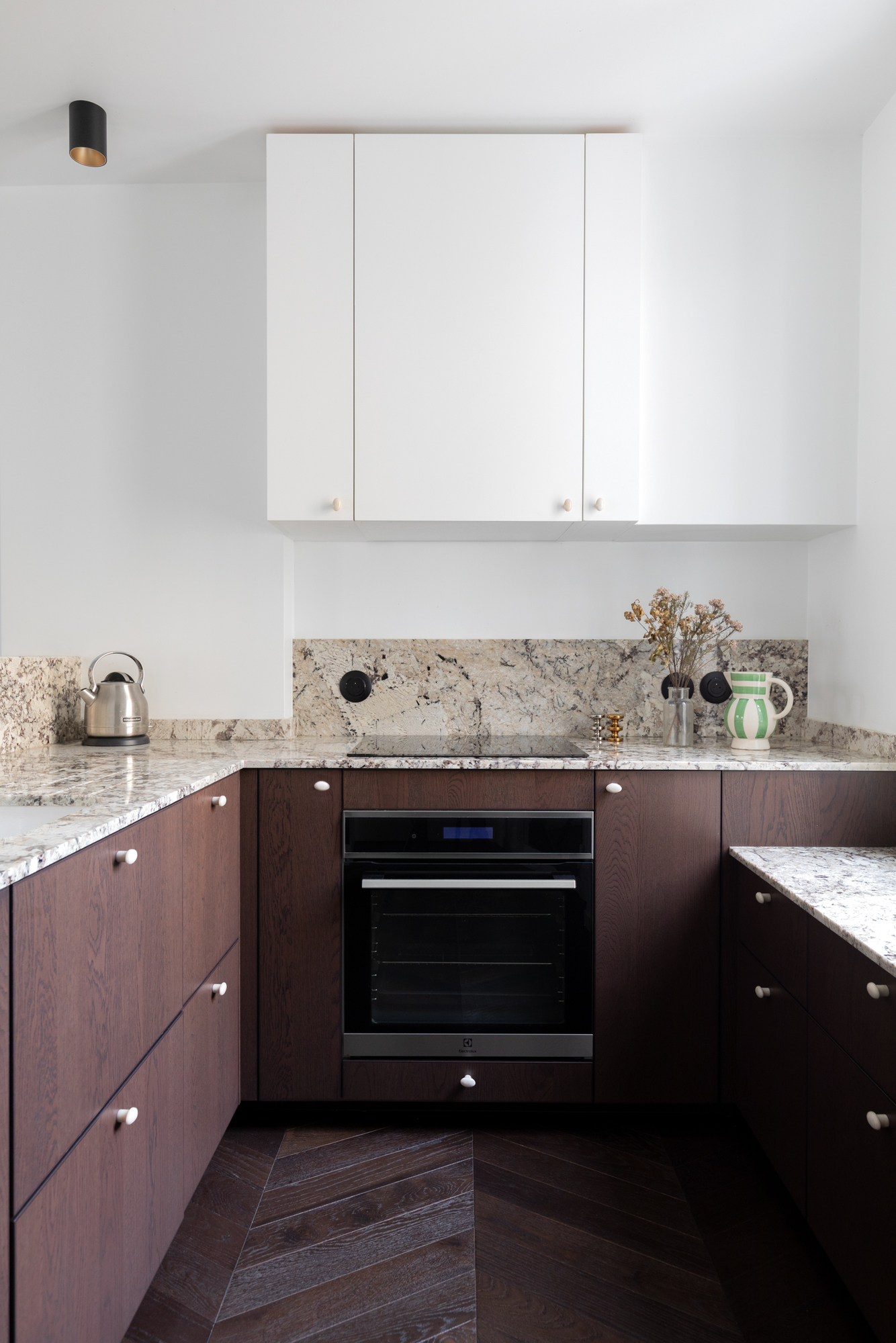 C’est la cuisine qui ouvre le bal ! Le parquet point de Hongrie en chêne teinté s’accorde aux façades des placards.