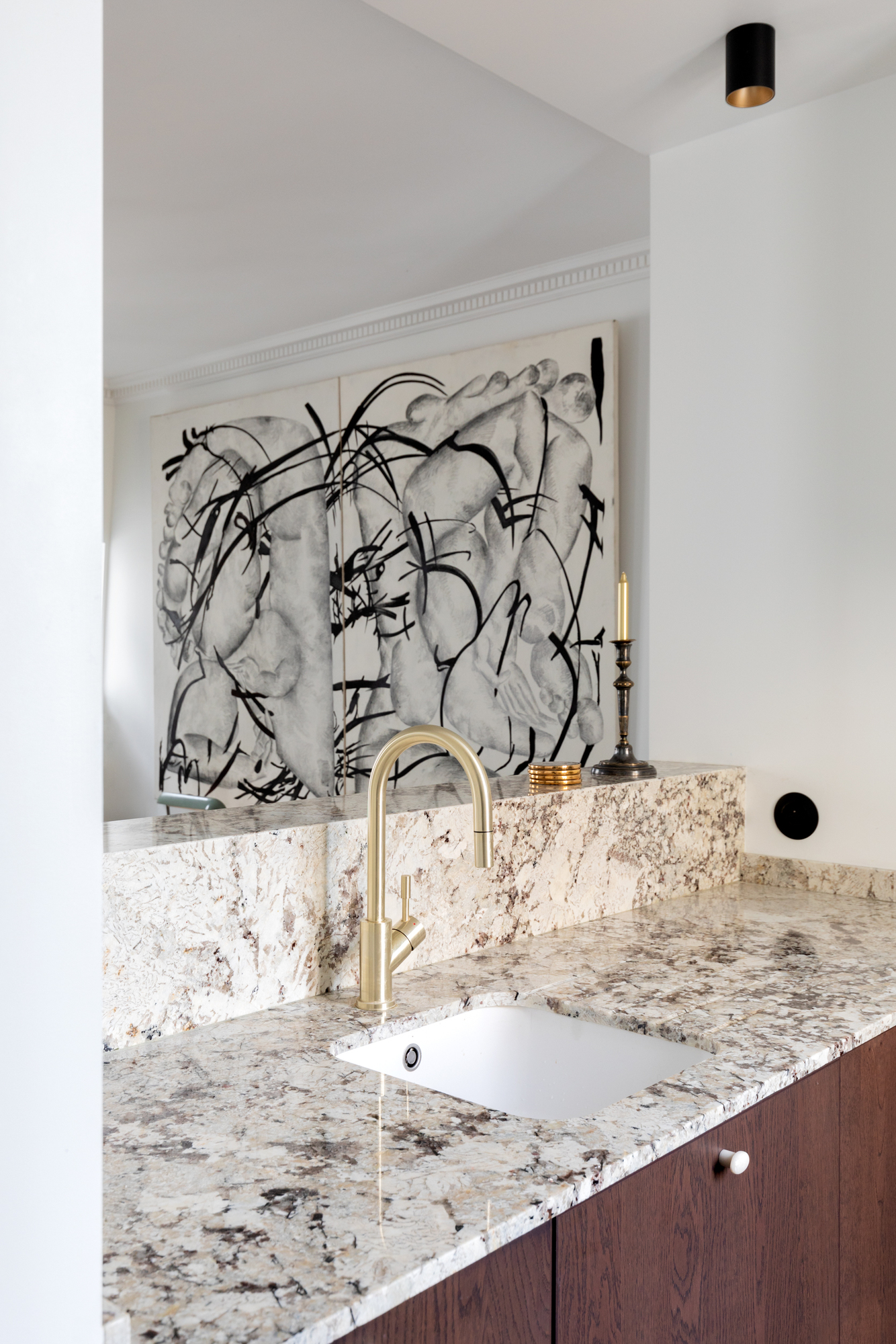 Partiellement ouverte sur le séjour, cette pièce conserve son intimité grâce à une partie bar surélevée par rapport au plan de travail en granite.