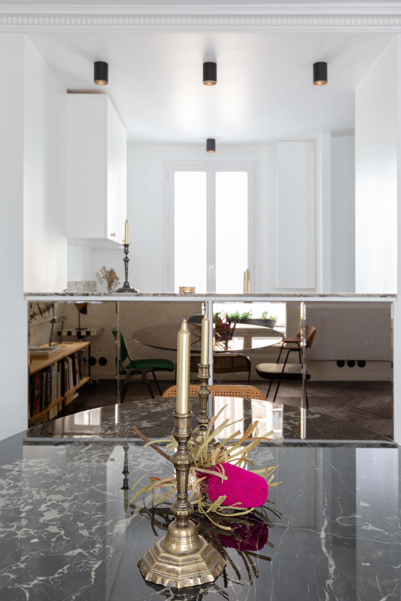 De l’autre côté on découvre un rangement habillé de miroir vieilli fumé. Parfait pour y ranger la vaisselle mais aussi agrandir visuellement l’espace !