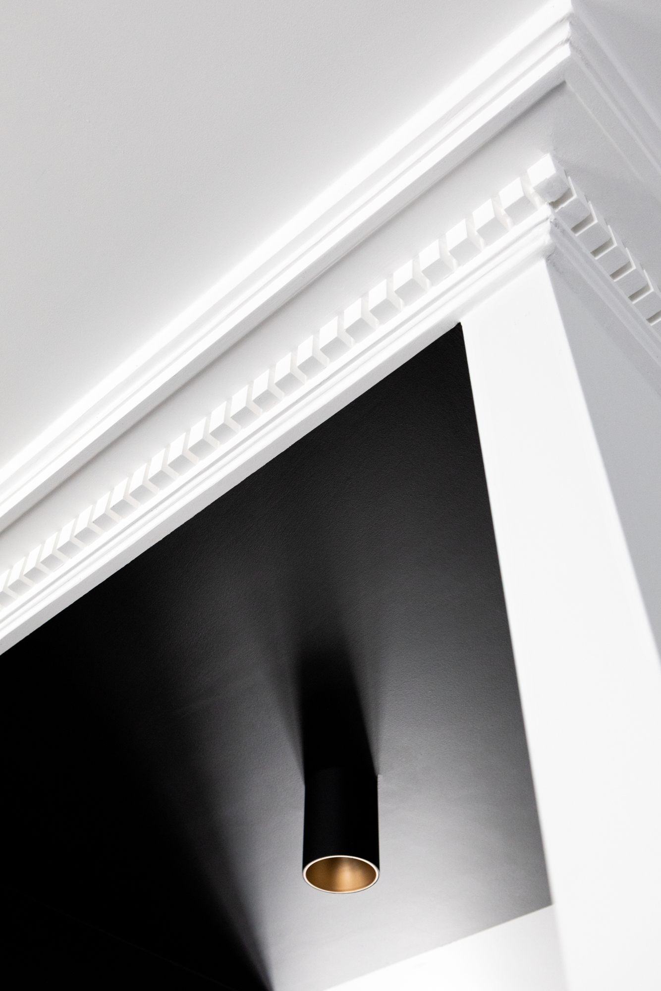 Ce passage se pare de noir pour établir un jeu de contrastes. Zoom sur le côté graphique de la corniche en staff, mélange de plâtre et de fibres végétales.