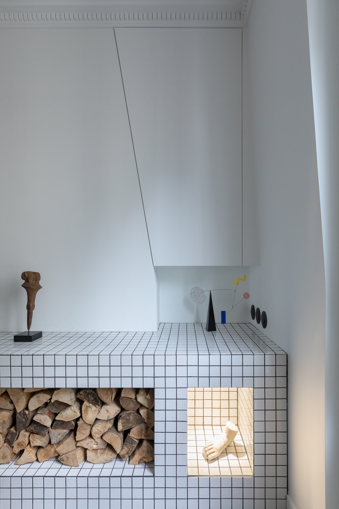 La cheminée d’origine est conservée mais totalement repensée dans un esprit design Memphis.