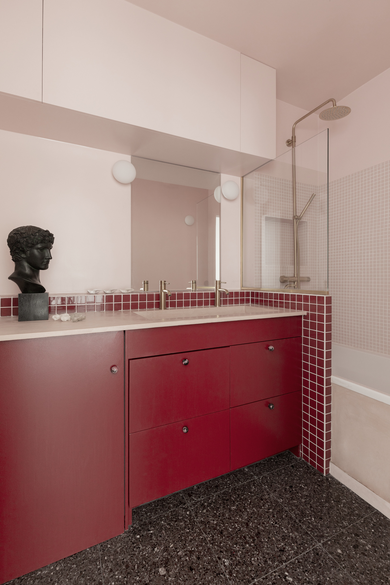 Les teintes bordeaux se marient au vieux rose, jusqu’au béton ciré du plan de travail. Sans oublier un ultime contraste avec le terrazzo au sol !