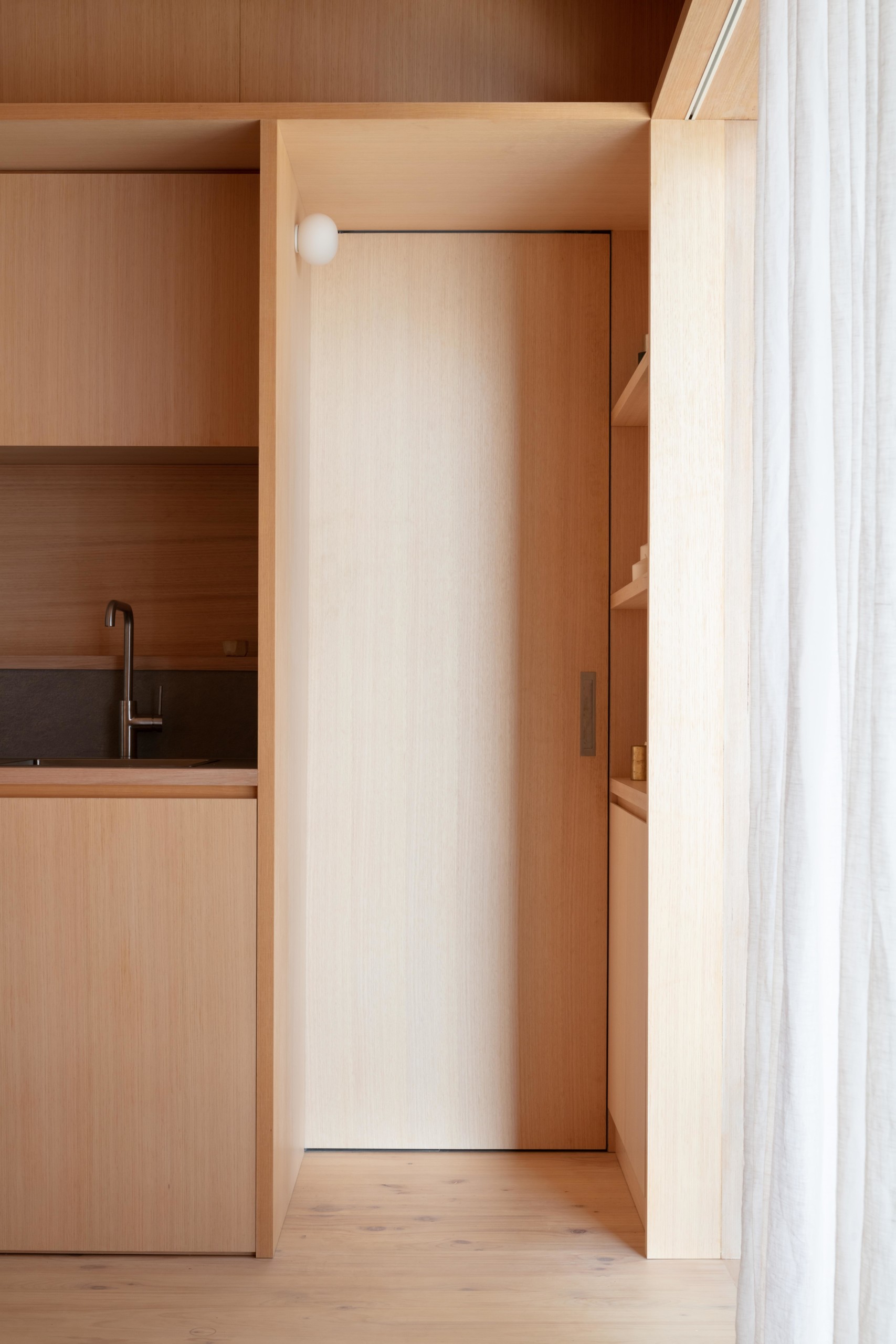 Pas de kitchenette dans cet espace ultra compact, mais une véritable cuisine ! Elle respecte les codes minimalistes et se fond dans le décor grâce à des modules de rangements réalisés sur-mesure dans la même essence de bois. La crédence en pierre apporte une touche minérale à l’espace.