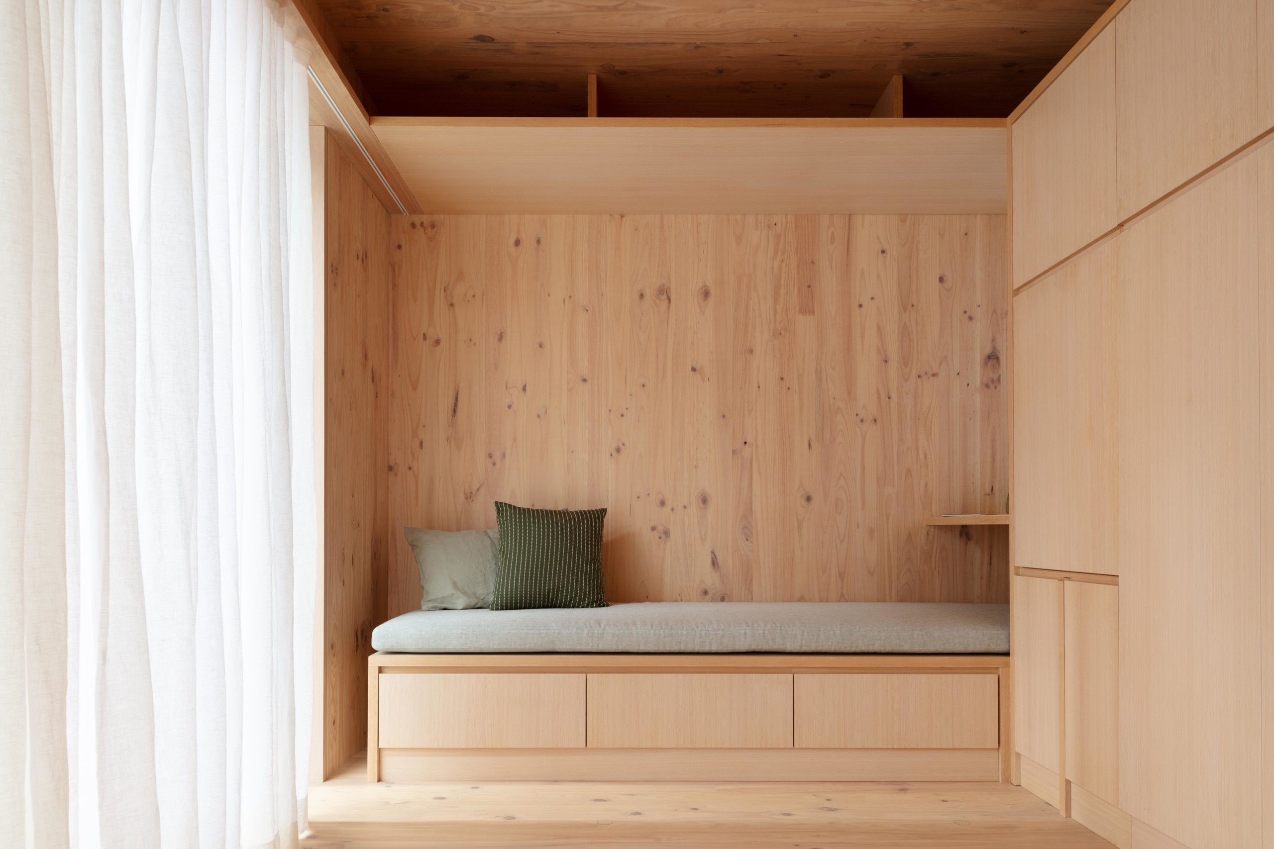 Le lit est lui aussi camouflé en journée par le module pour optimiser l’espace et dégager le regard. On le déplie à la nuit tombée !