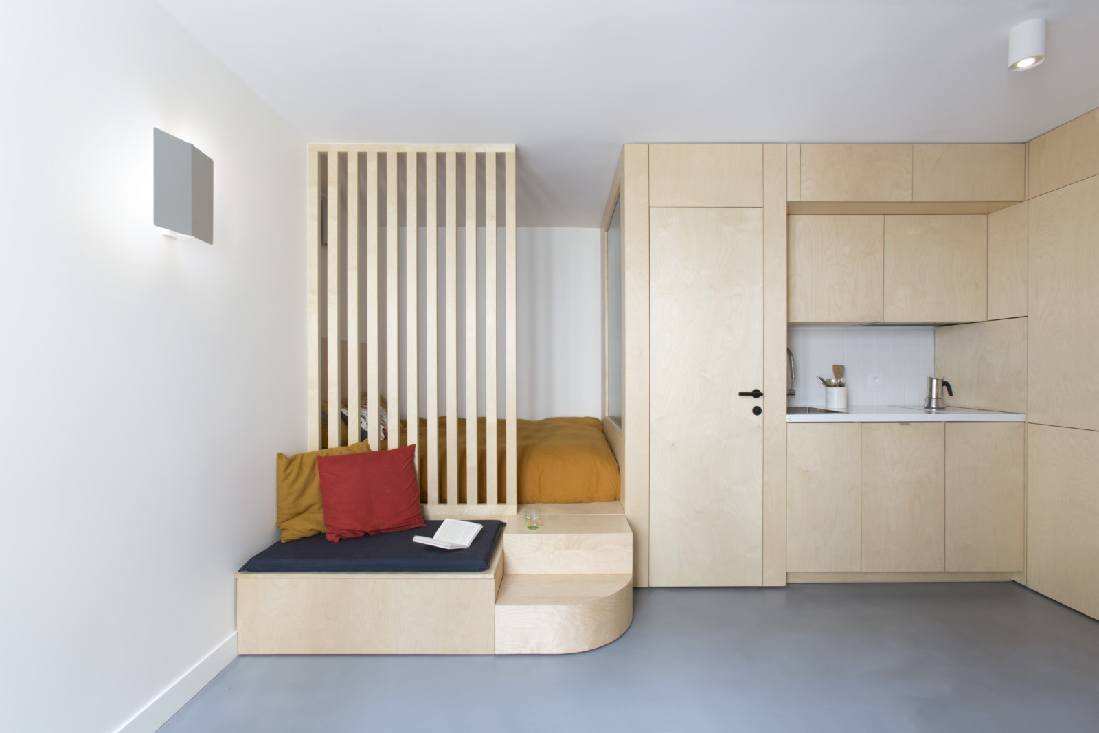 Deux lignes galbées se cachent d’ailleurs dans ce module regroupant cuisine, coin nuit et un accès à la salle d’eau : les avez-vous trouvées ?