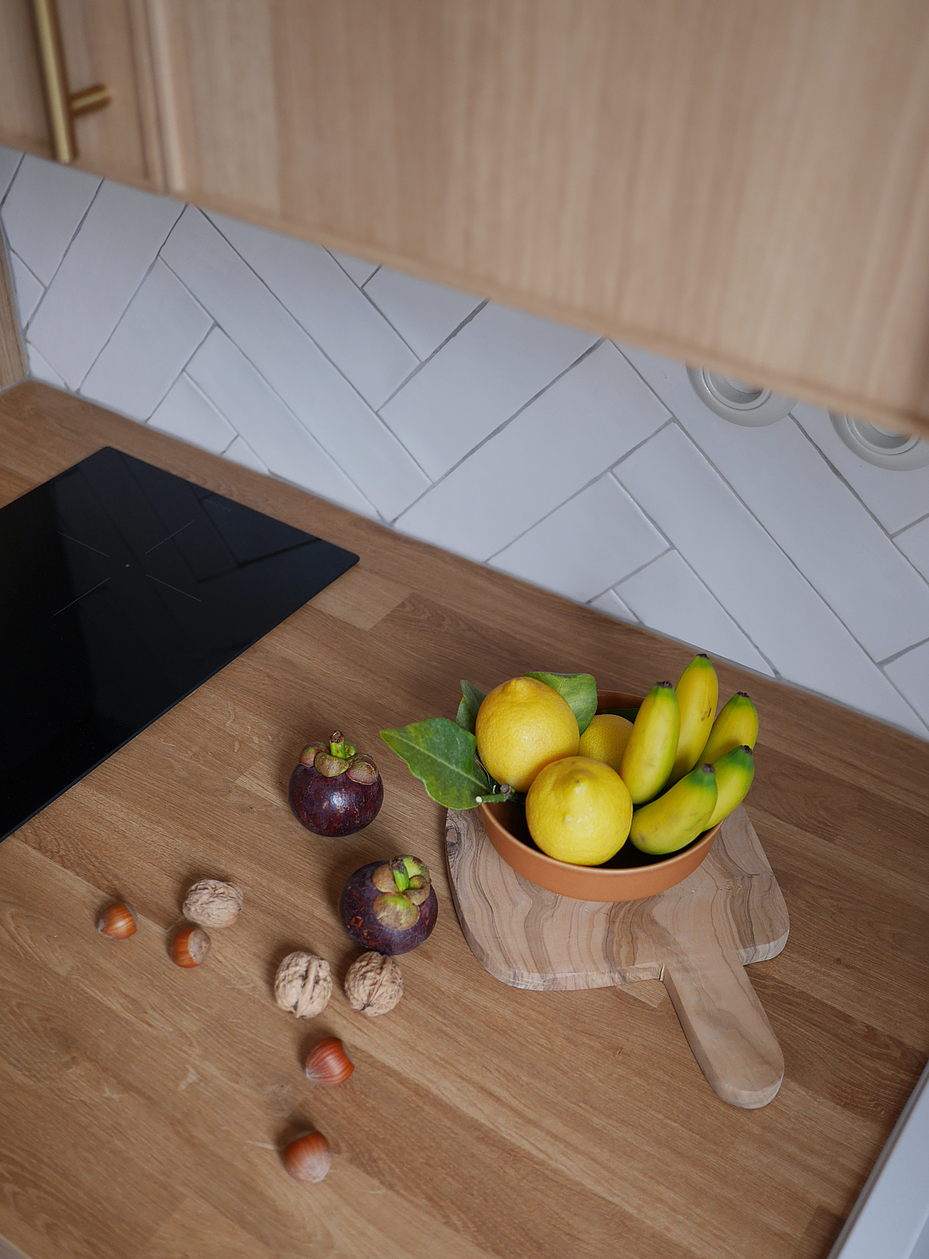 Le plan de travail est en bois. Pour une cohérence avec les placards toute hauteur.