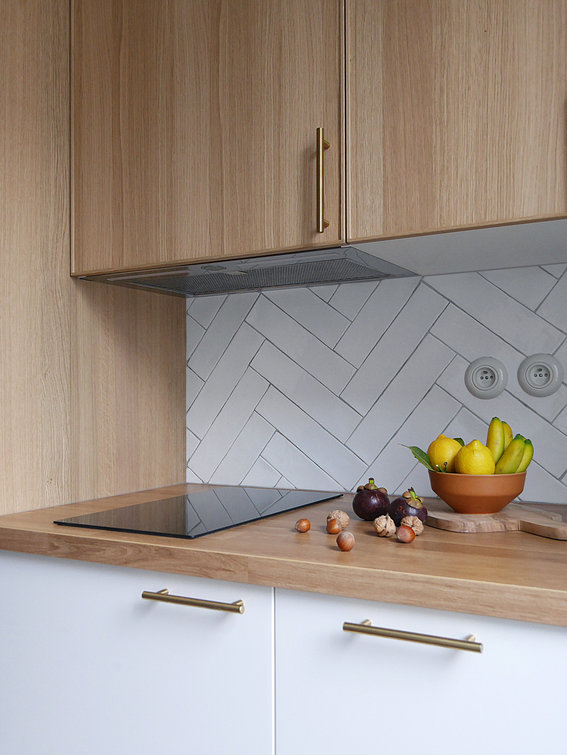 Vue de face de la cuisine. Les poignées en laiton apportent une touche élégante à la composition. La crédence en faïence a été posée en chevrons, pour un bel effet tapissier.