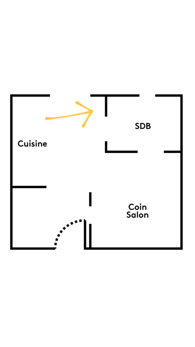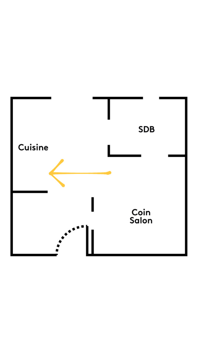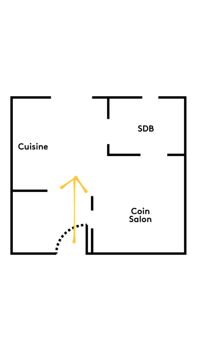 On entre dans l’appartement. L’entrée donne sur l’espace cuisine & repas.