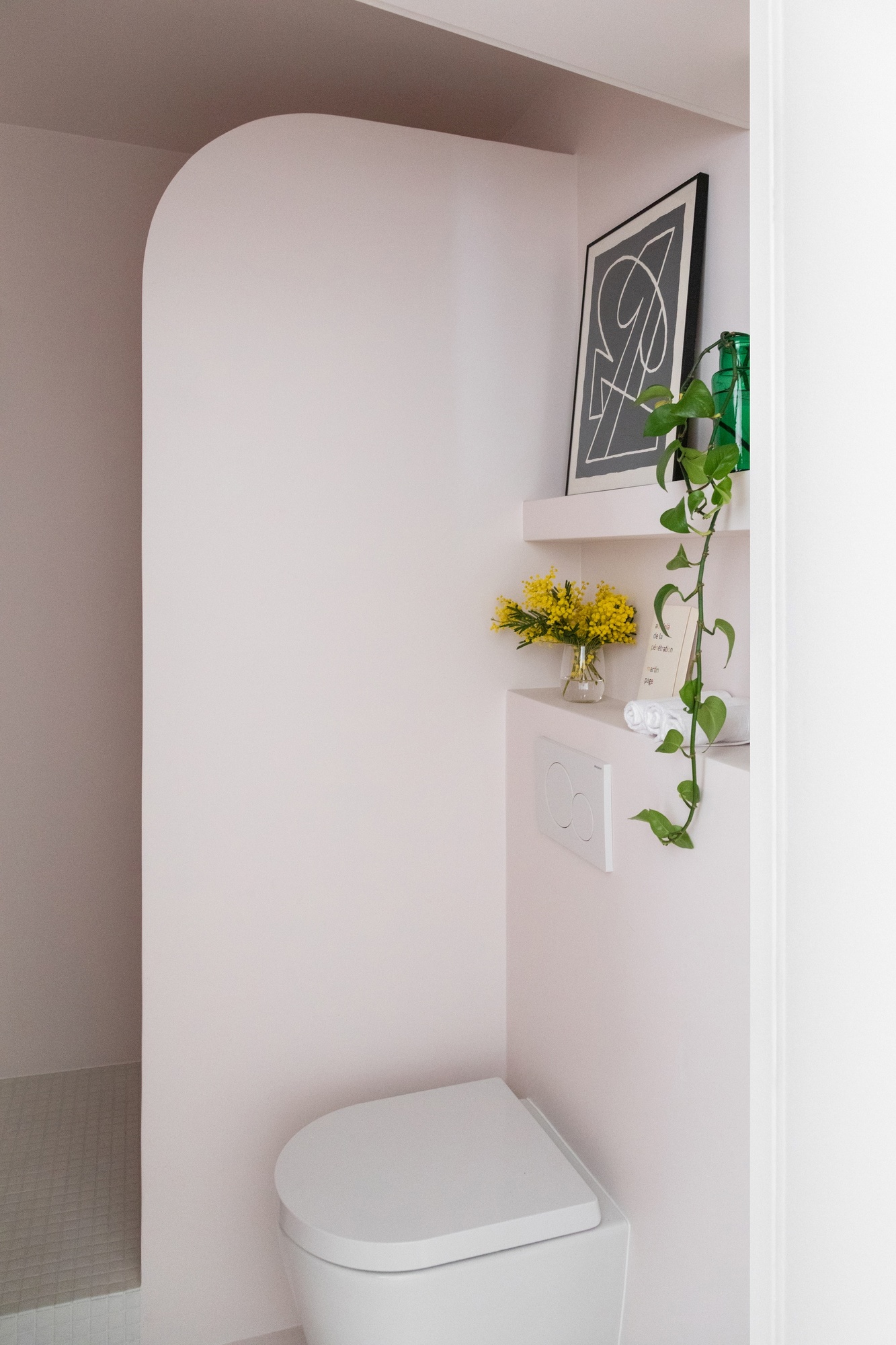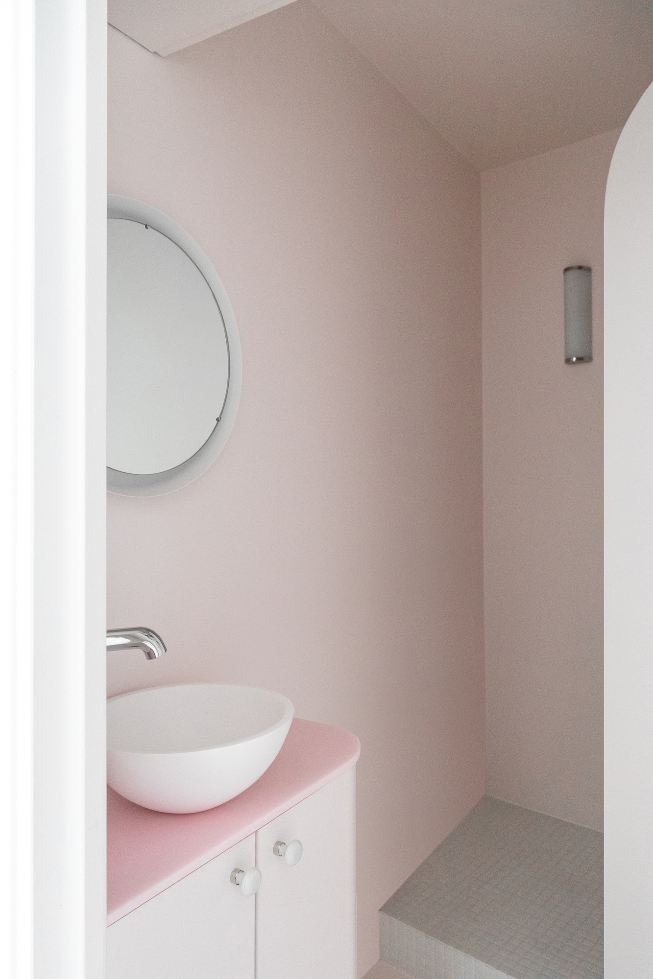Couleurs acidulées et courbes : la salle d’eau reprend, elle aussi, les codes déployés partout dans le studio.