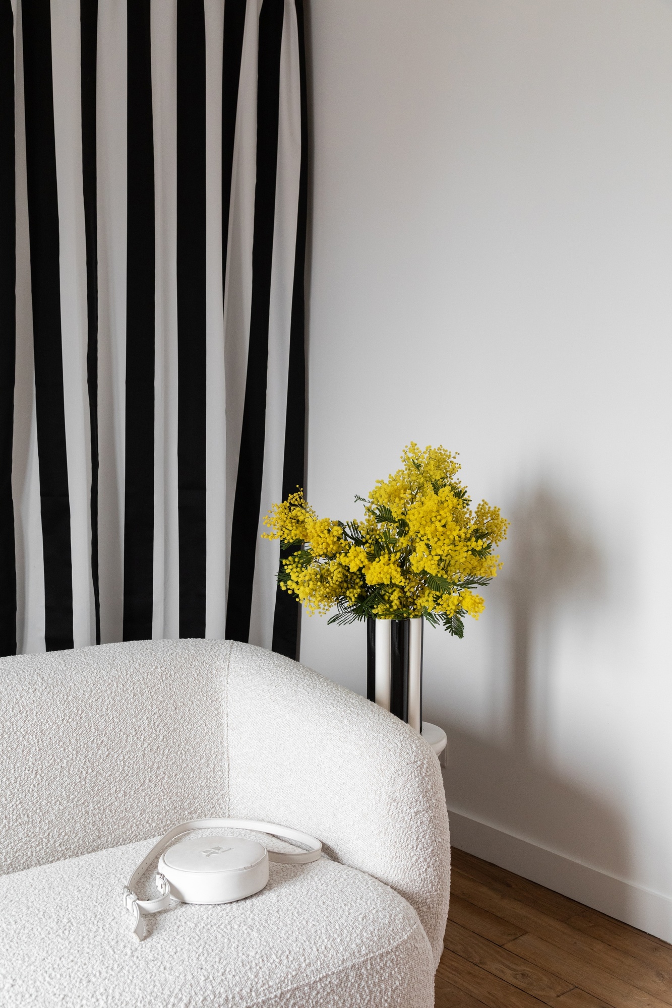 Ce grand rideau poursuit l’idée du contraste des couleurs, tout en masquant le dressing.