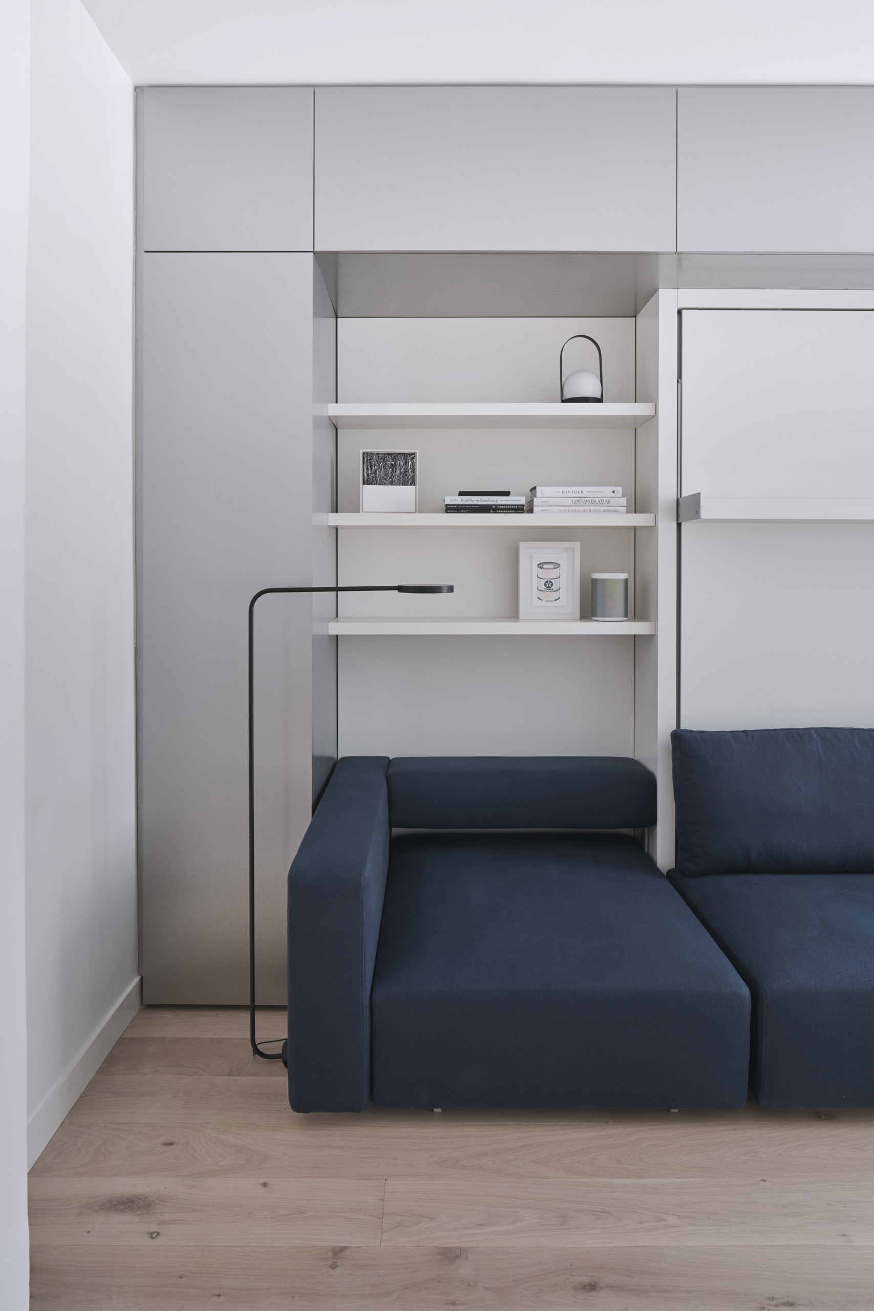 Un module en arche s’étend au-dessus du canapé. En plus d’être fonctionnel, il définit l’espace du séjour, tout en subtilité.