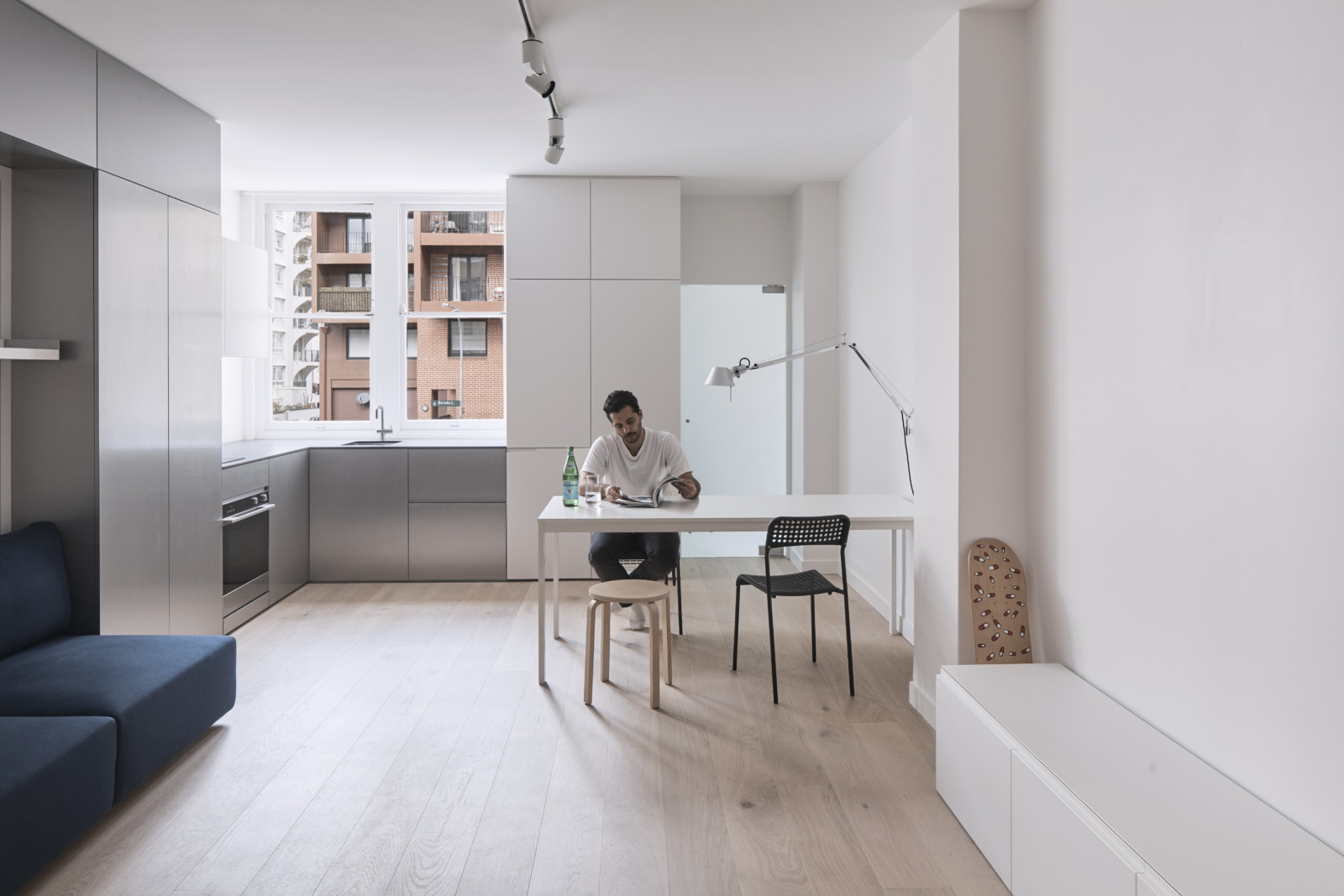 L’entrée dans l’appartement se fait par une extrémité, donnant ainsi une vue globale du très lumineux studio. Comme un tableau, la large baie, située dans un coin de la pièce, offre un spectacle sur l’architecture de la ville.