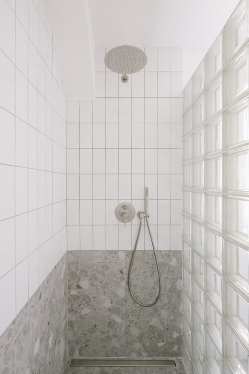 Une paroi en pavés de verre protège la salle d’eau des éclaboussures tout en assurant une grande luminosité dans la douche. Le soubassement est formé d’un carrelage terrazzo aux tons gris, en référence à l’inox présent dans le reste de l’appartement.