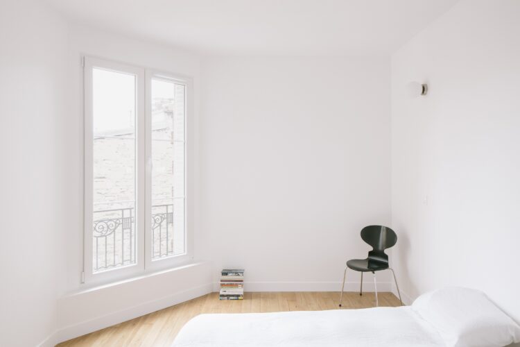La chambre est blanche et épurée. Les architectes ont réalisé des travaux « invisibles » : inhabité depuis plusieurs années, l’appartement est ainsi passé de la classe F à la classe C grâce à l’isolation intérieure en fibre de bois (10 centimètres sur les murs périphériques), préservant la façade Art déco.