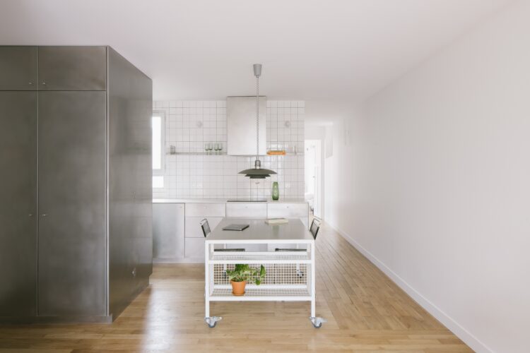 La faïence blanche 10 x 10 centimètres renforce l’esthétique épurée du projet. Selon Charlotte Guillochon, cofondatrice de l’Atelier Apara avec Victor Mesguich, « l’acier inoxydable s’est imposé comme le matériau phare de l’appartement. En plus de ses qualités esthétiques, il est extrêmement résistant, un atout essentiel pour un espace comme la cuisine. Son aspect froid et industriel crée un contraste intéressant avec la chaleur du parquet et le charme parisien de l’appartement ».