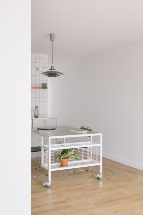 La cuisine est organisée autour d’un îlot central en inox, mobile et multifonction : poste de travail, espace de repas et lieu de réception. Pour libérer l’espace, il peut être facilement déplacé. L’omniprésence du blanc renforce la luminosité de ce volume minimaliste.