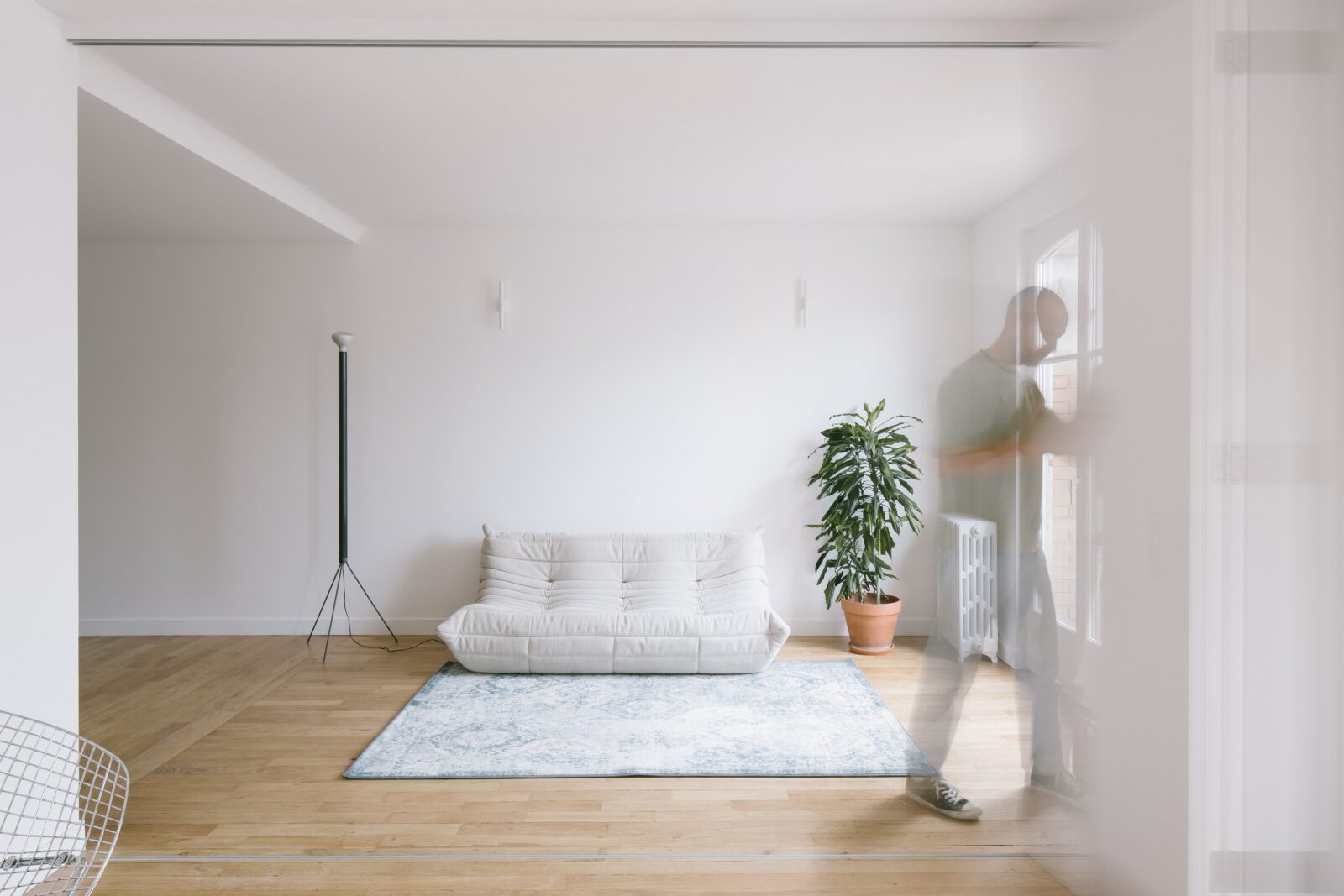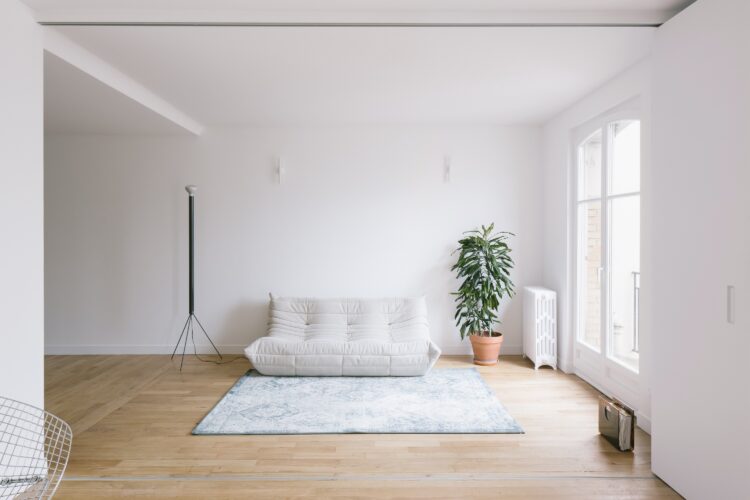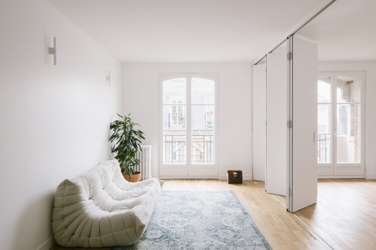 Le système de portes accordéon permet de séparer la pièce de vie pour créer, selon les besoins, une seconde chambre. En mode salon, un canapé Togo 3 places gris perle, édité par Ligne Roset et conçu par Michel Ducaroy, accueille les visiteurs.