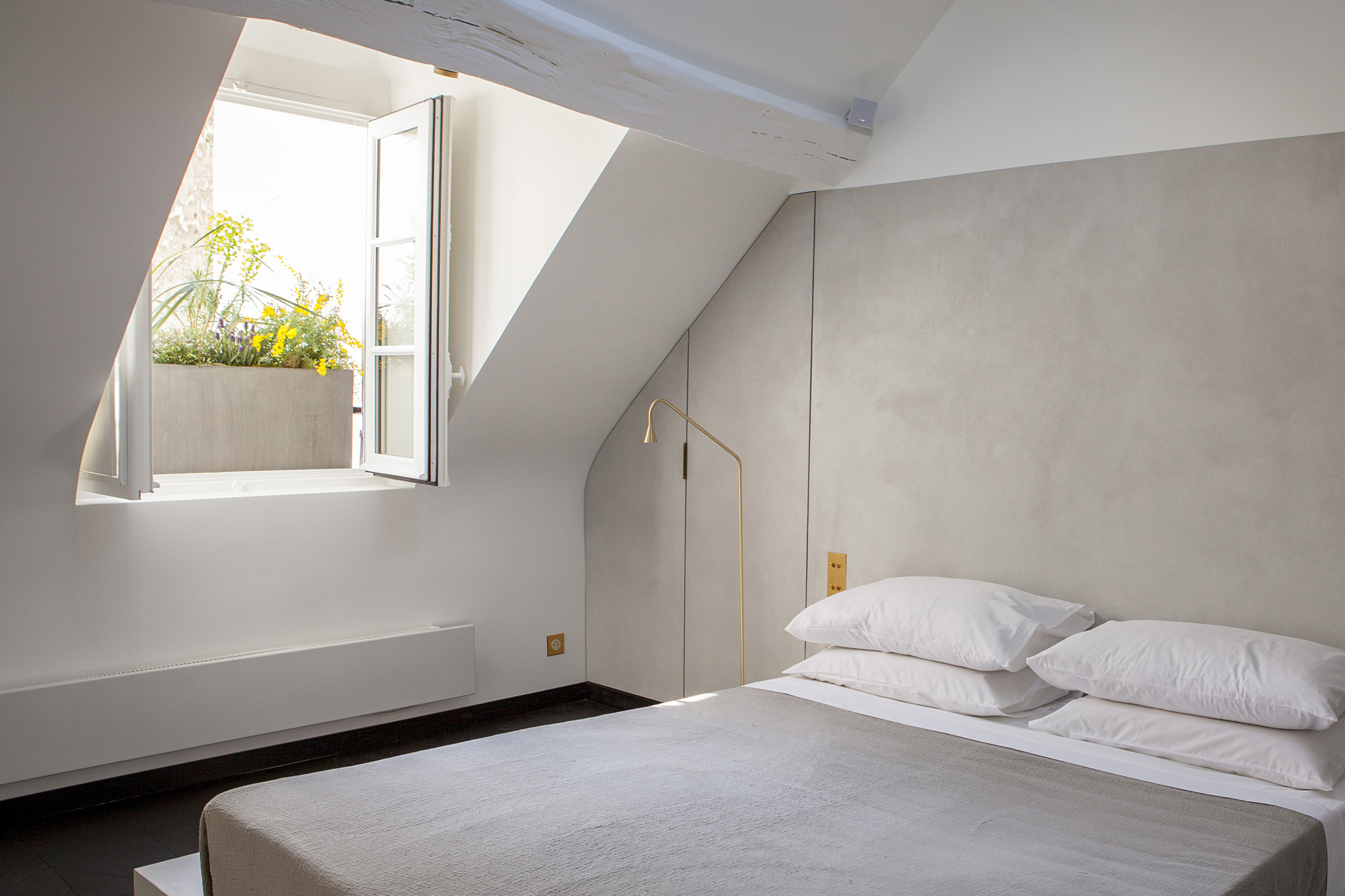 Les lampes de chevet sont des LVI Milo Rock et opèrent un rappel avec le laiton du séjour.