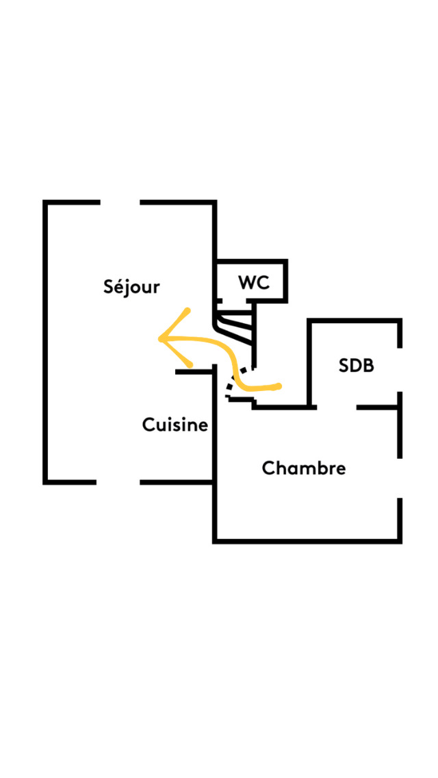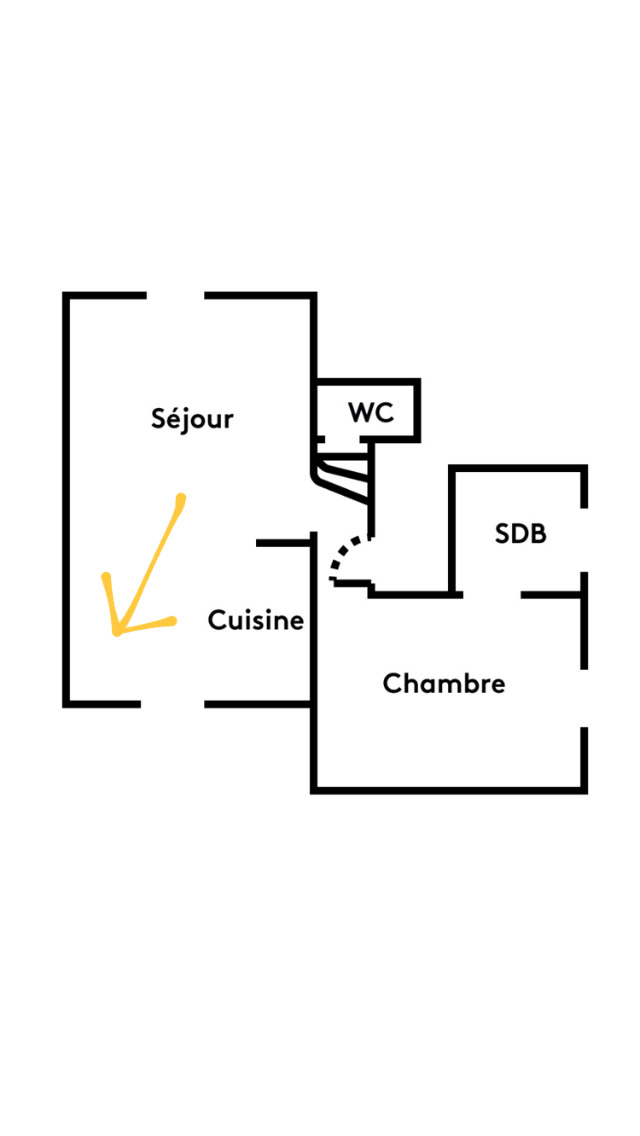 Nous arrivons dans le séjour depuis le petit sas d’entrée avec ses marches.