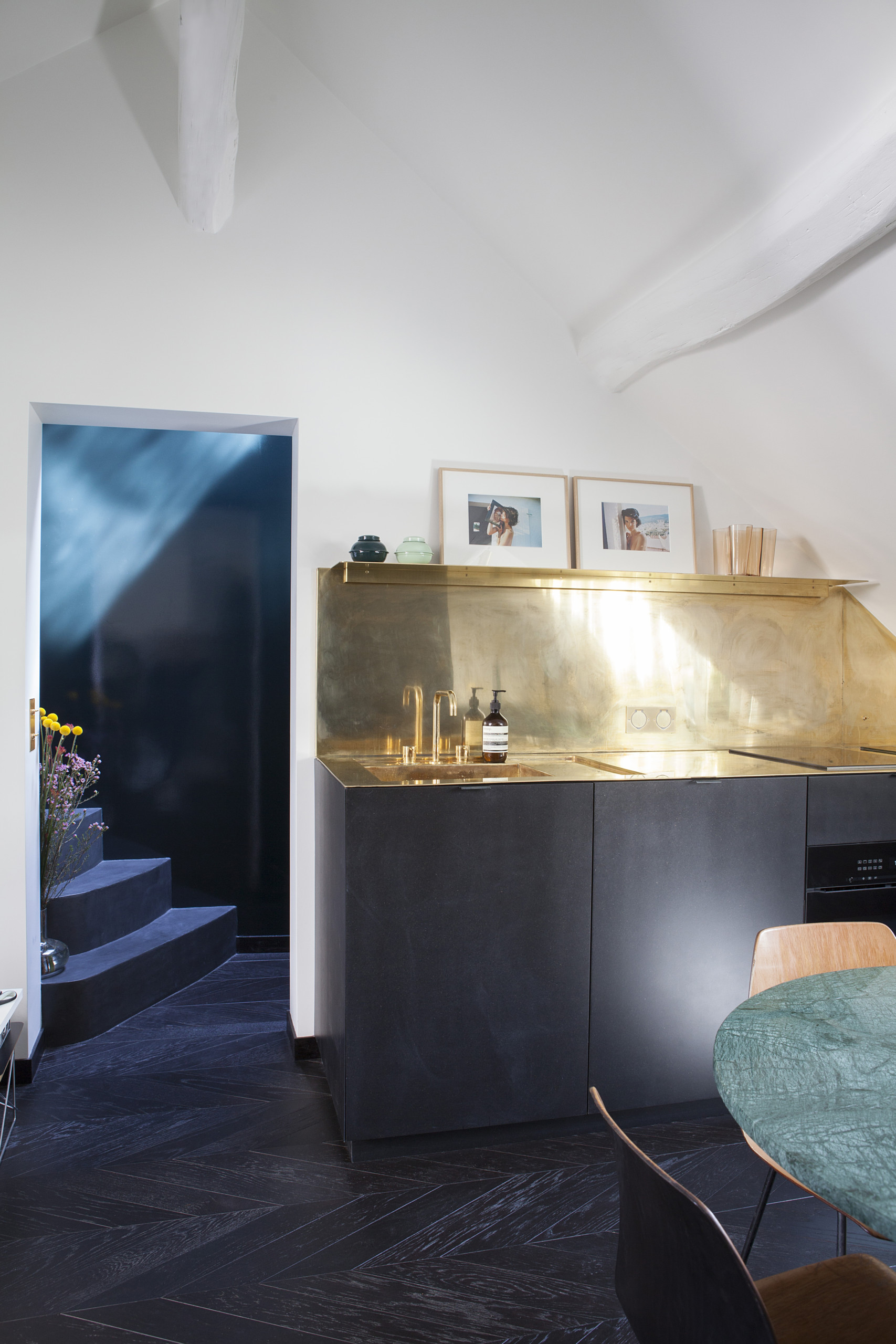 On se déplace vers la salle à manger. Dans la continuité du soubassement noir, des placards sur mesure. On remarque le miroir posé dans la lucarne pour maximiser la lumière.