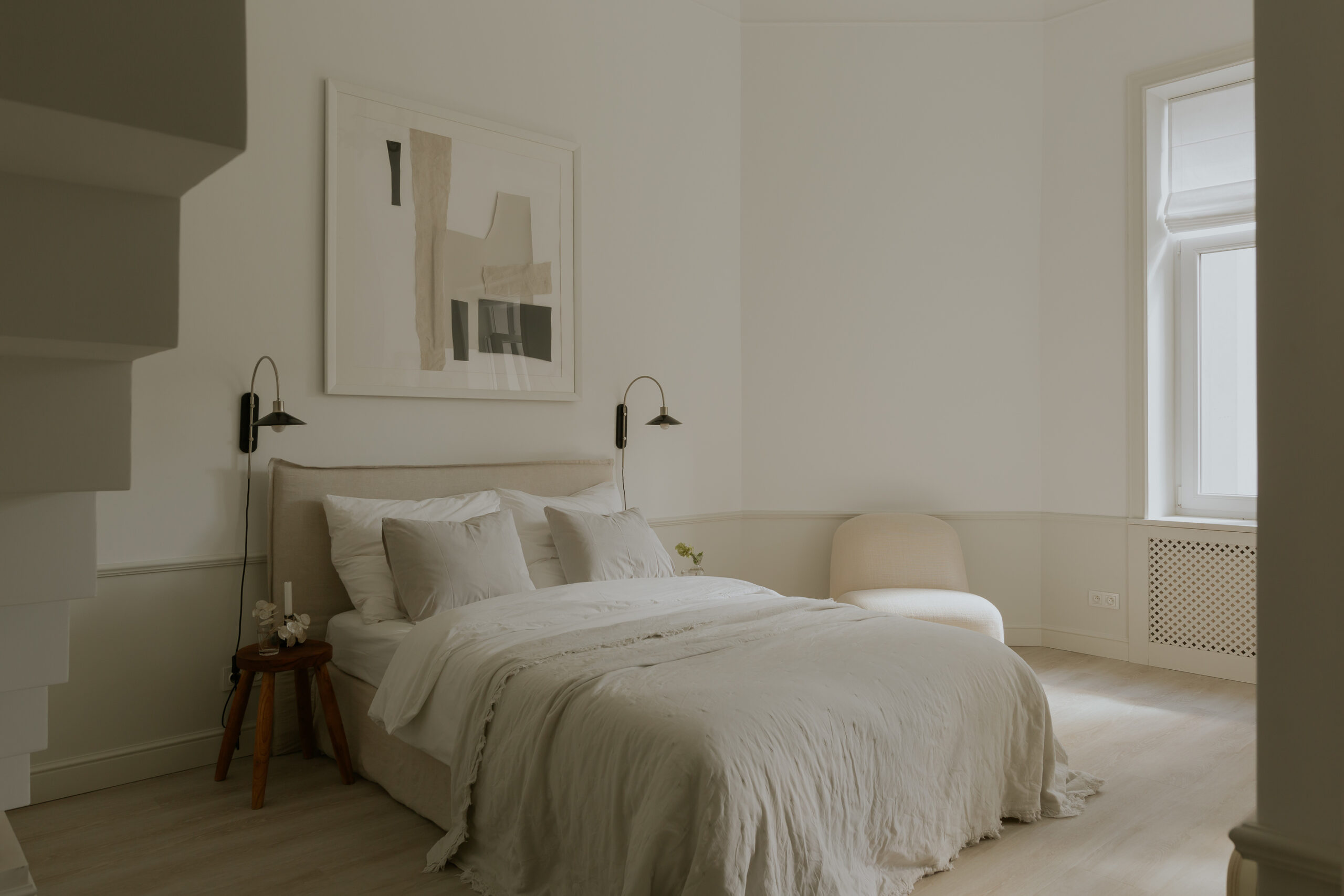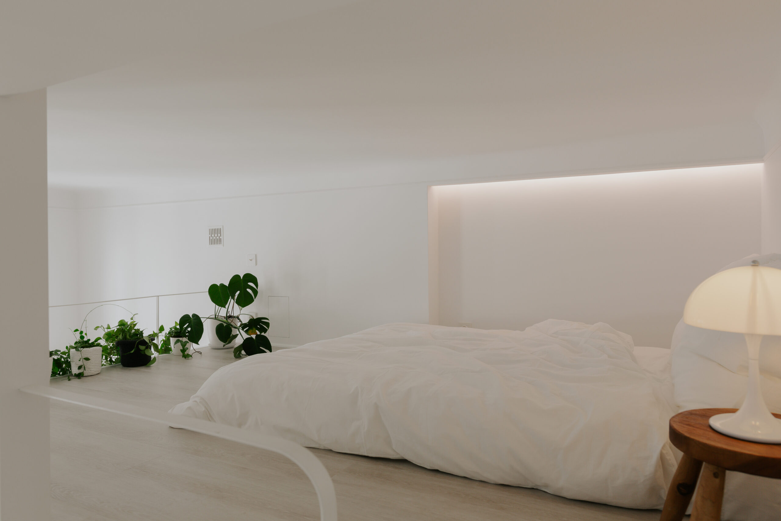 La propriétaire aime beaucoup le blanc mais pour éviter un rendu trop classique et structurer l’ensemble, l’architecte a ajouté des stucs au bas des murs, peints en gris porcelaine. D’autres courent également au plafond. Le lit, lui, a été conçu sur mesure. La plupart de ses textiles sont en lin naturel.