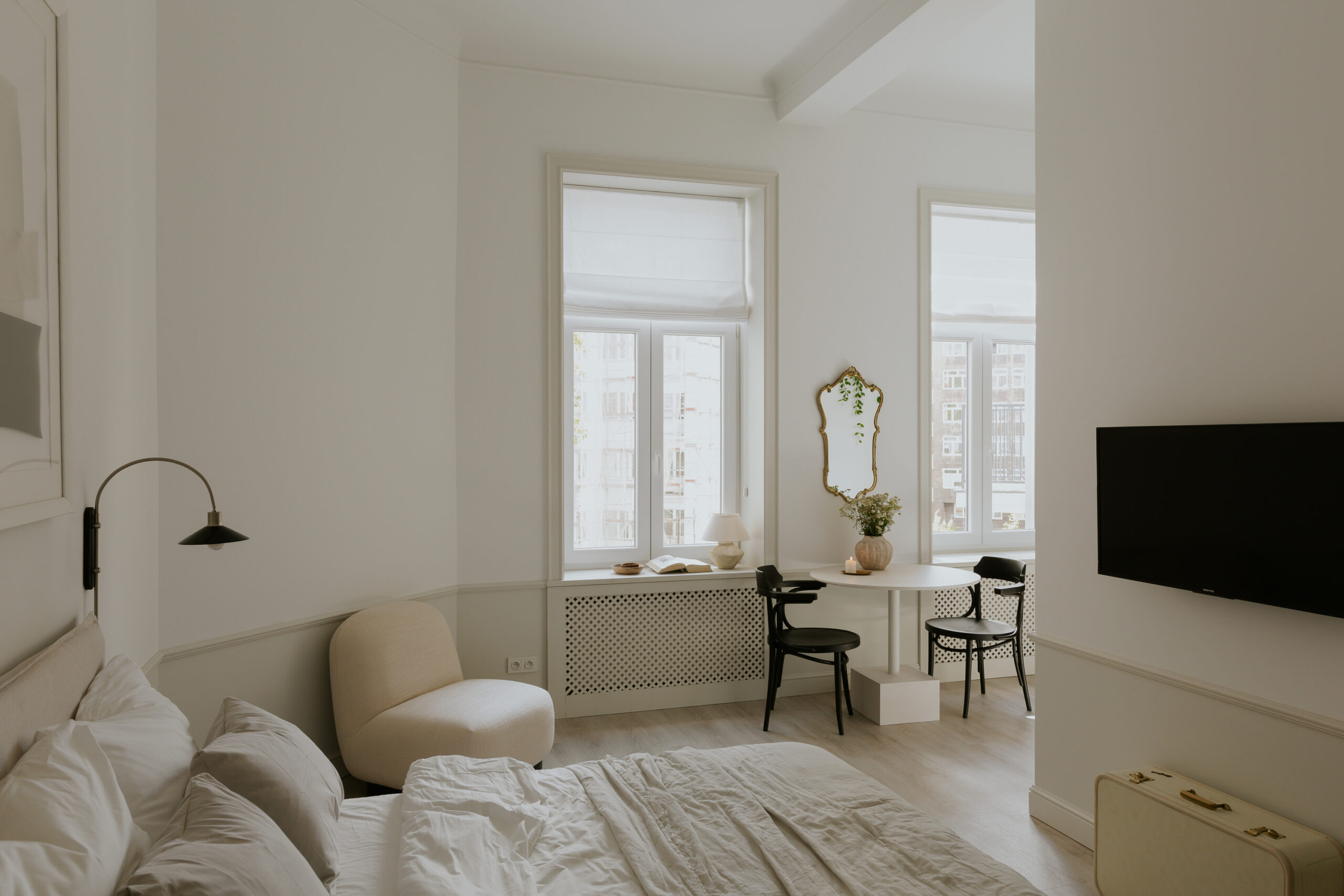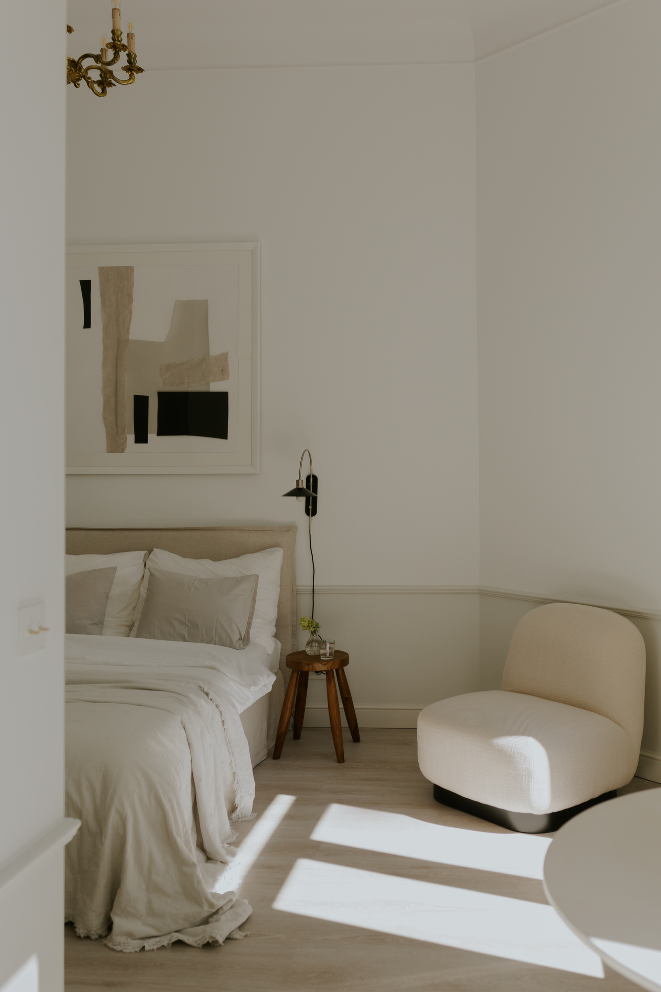 La chambre dialogue directement avec l’espace salon, abreuvé de lumière par de grandes fenêtres. Les encadrements de ces dernières ont été peints eux aussi en gris porcelaine afin de les mettre en valeur, tout en soulignant l’héritage architectural de ce bâtiment du XXe siècle.