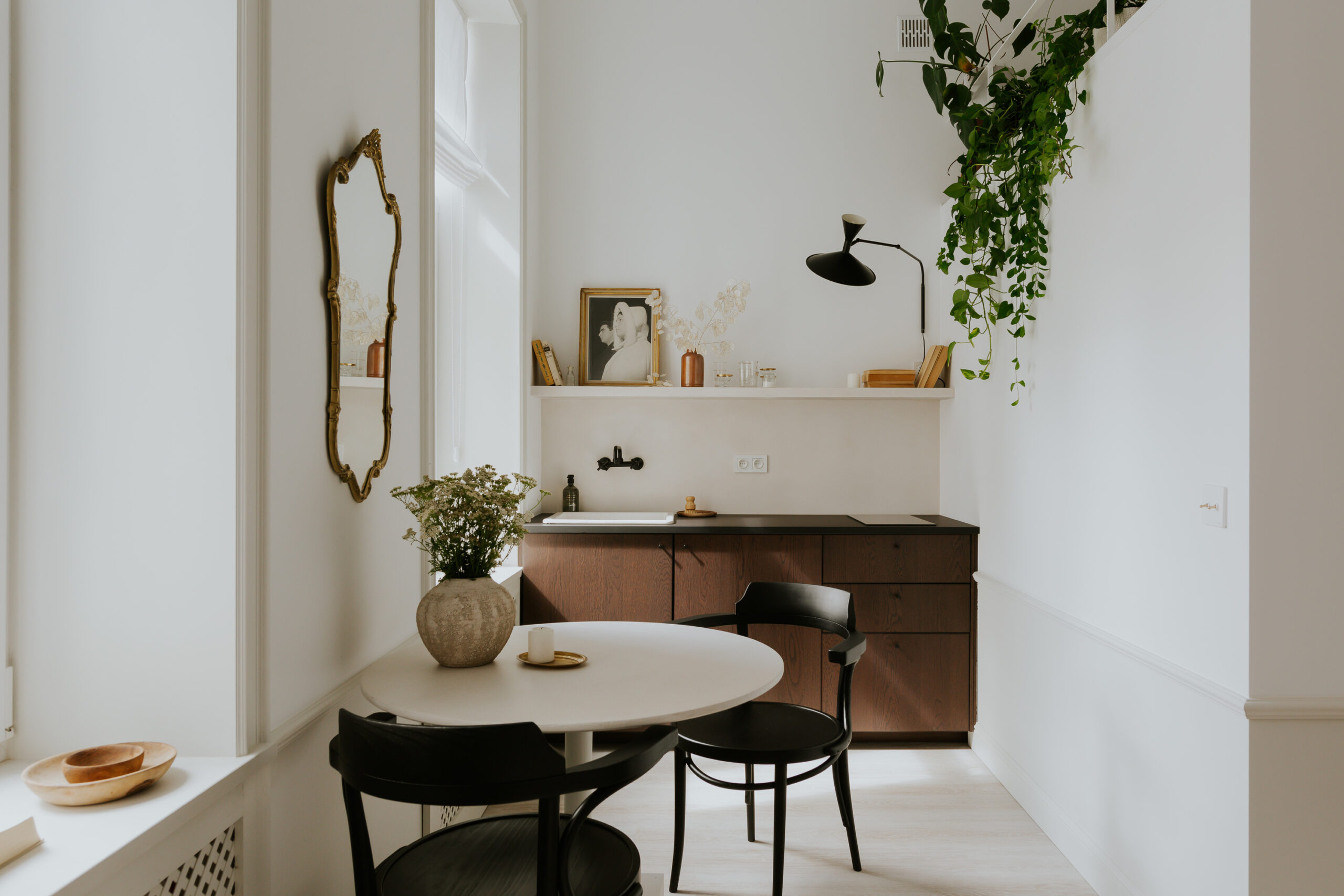 L’architecte a opté pour du sombre pour la couleur du placage des placards de cuisine, à l’image des chaises en bois ou du mitigeur cramponné au mur. Le but ? Conférer profondeur et caractère à l’ensemble.