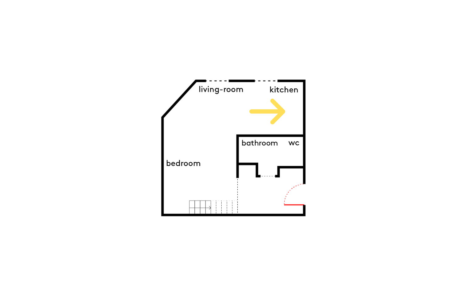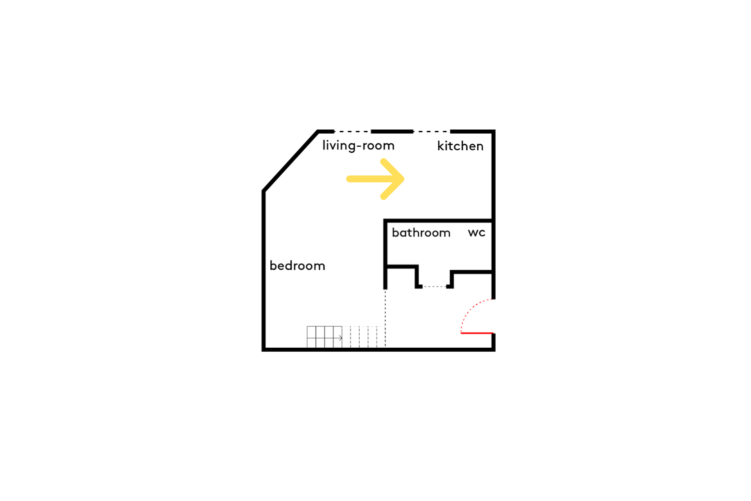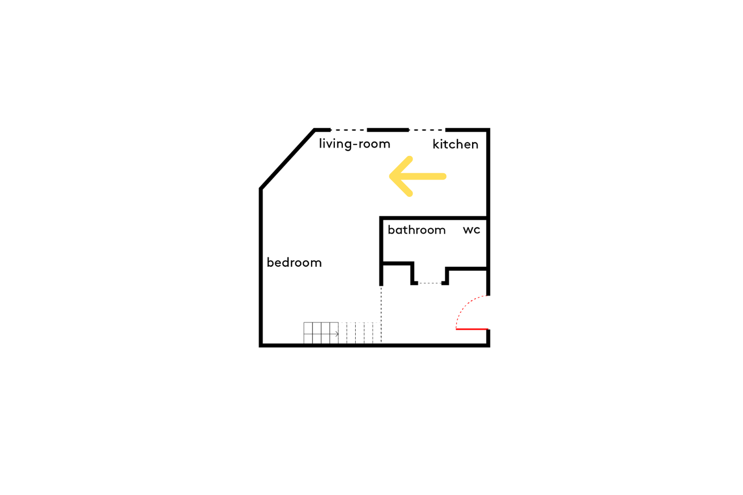 Le couloir d’entrée, qui dissimule ses rangements derrière des rideaux, mène à la chambre. Ce qui frappe d’emblée dans cet appartement, c’est la hauteur sous plafond impressionnante de 3,50 mètres.