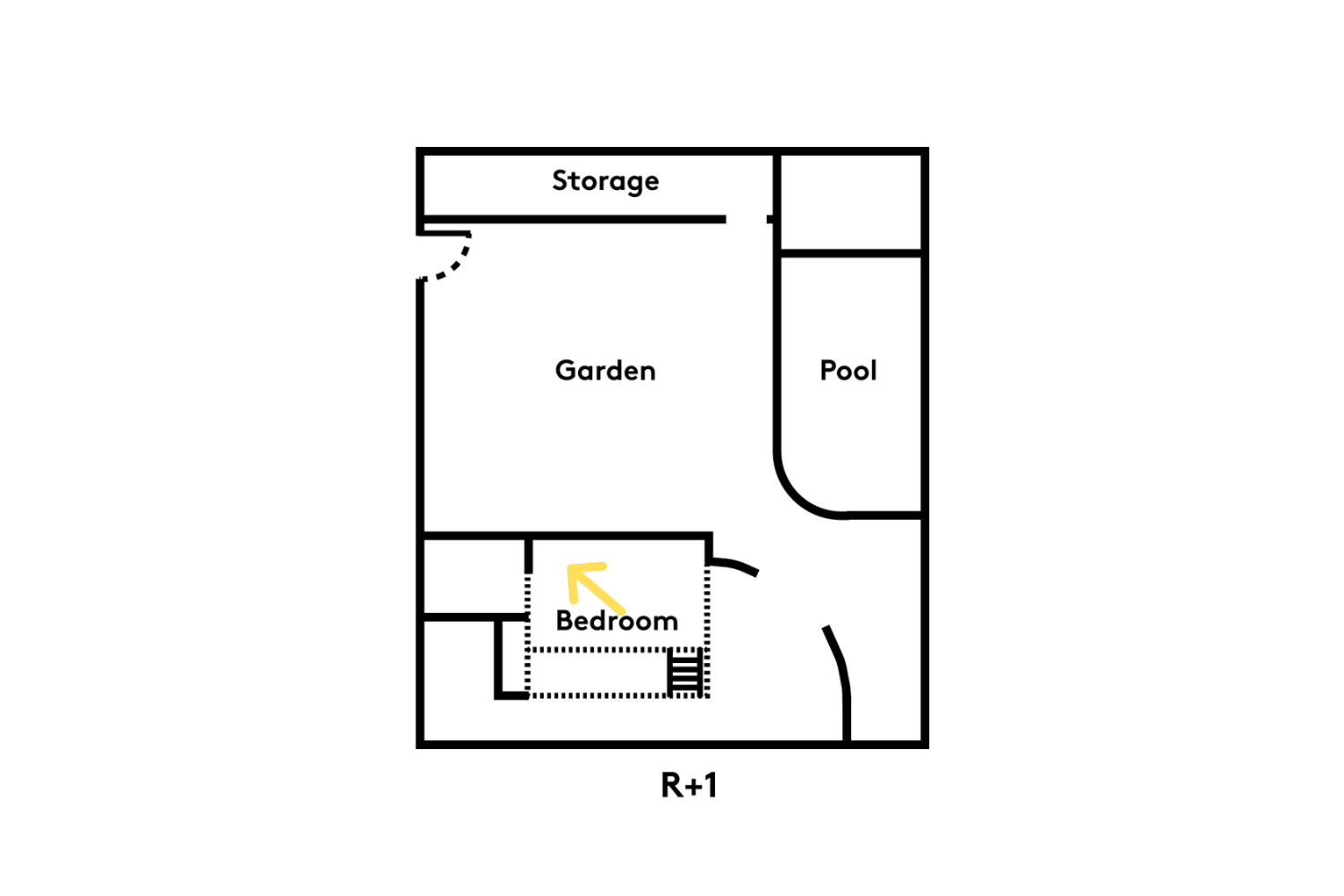 C’est par une échelle en bois à rambarde métallique que nous accédons à la chambre.