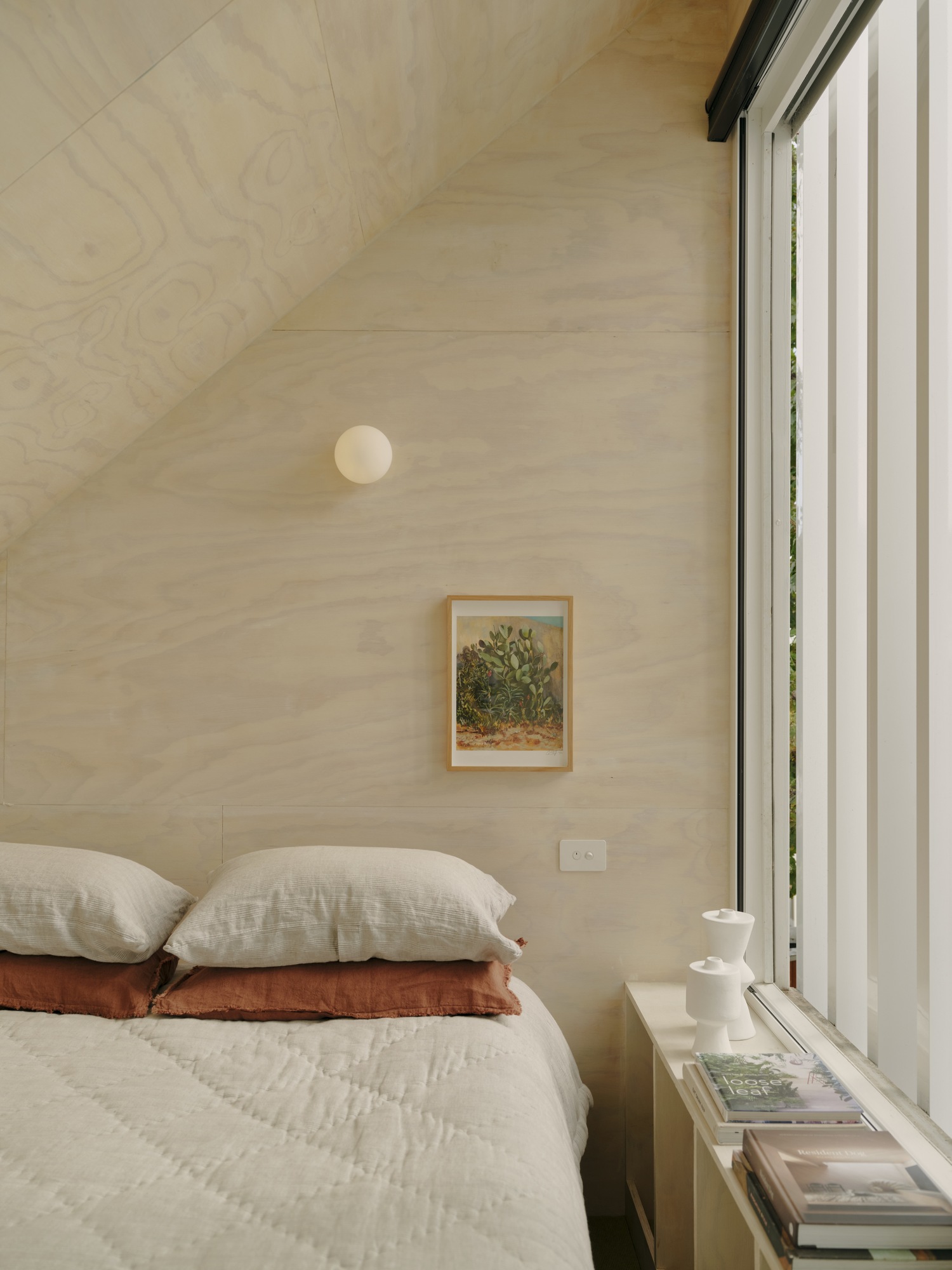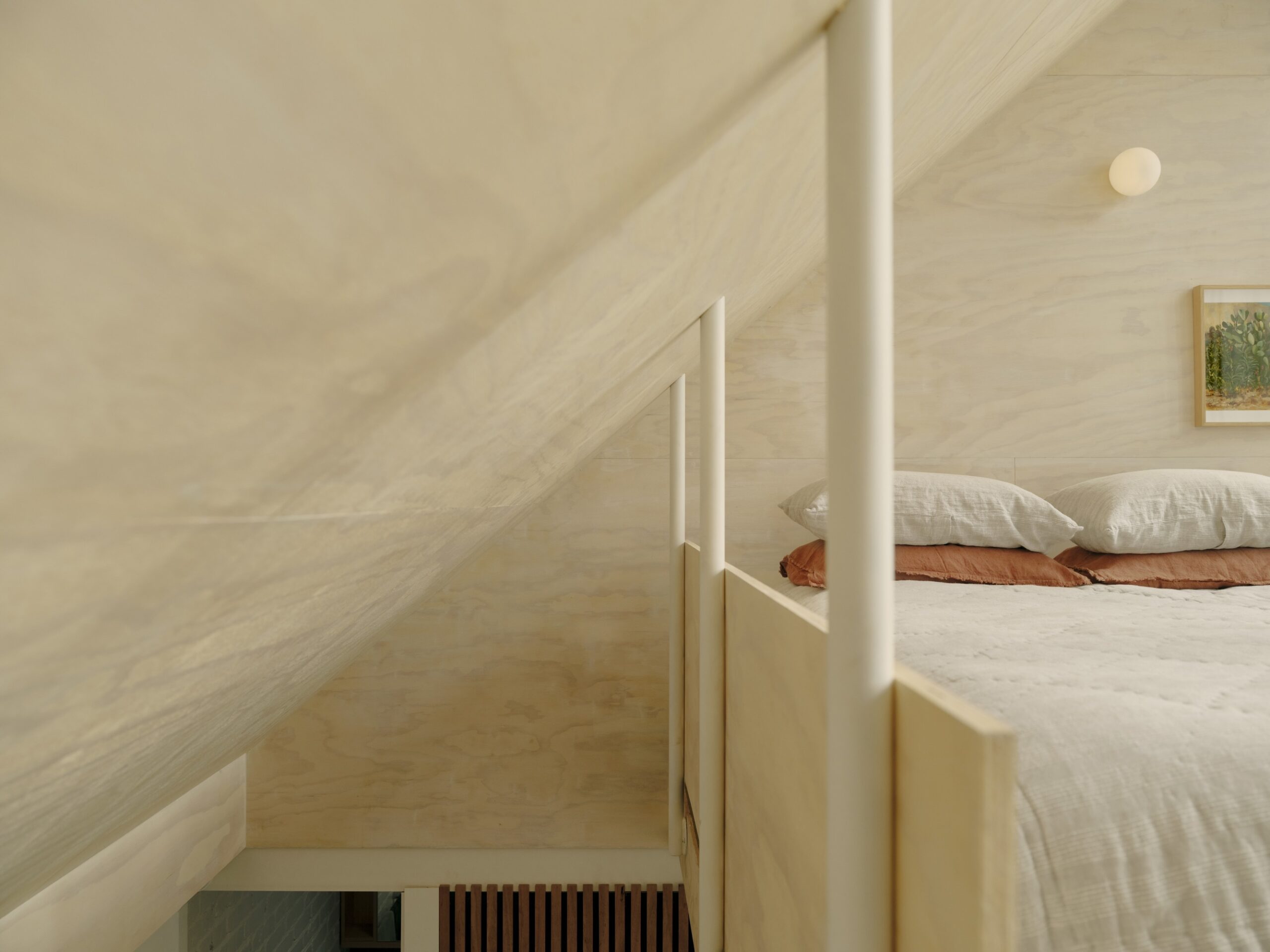 Comme l’entièreté du projet, la chambre à coucher optimise son volume grâce à son plafond mansardé…