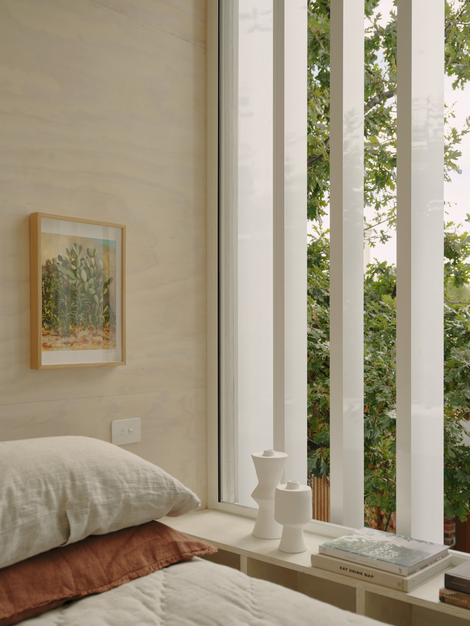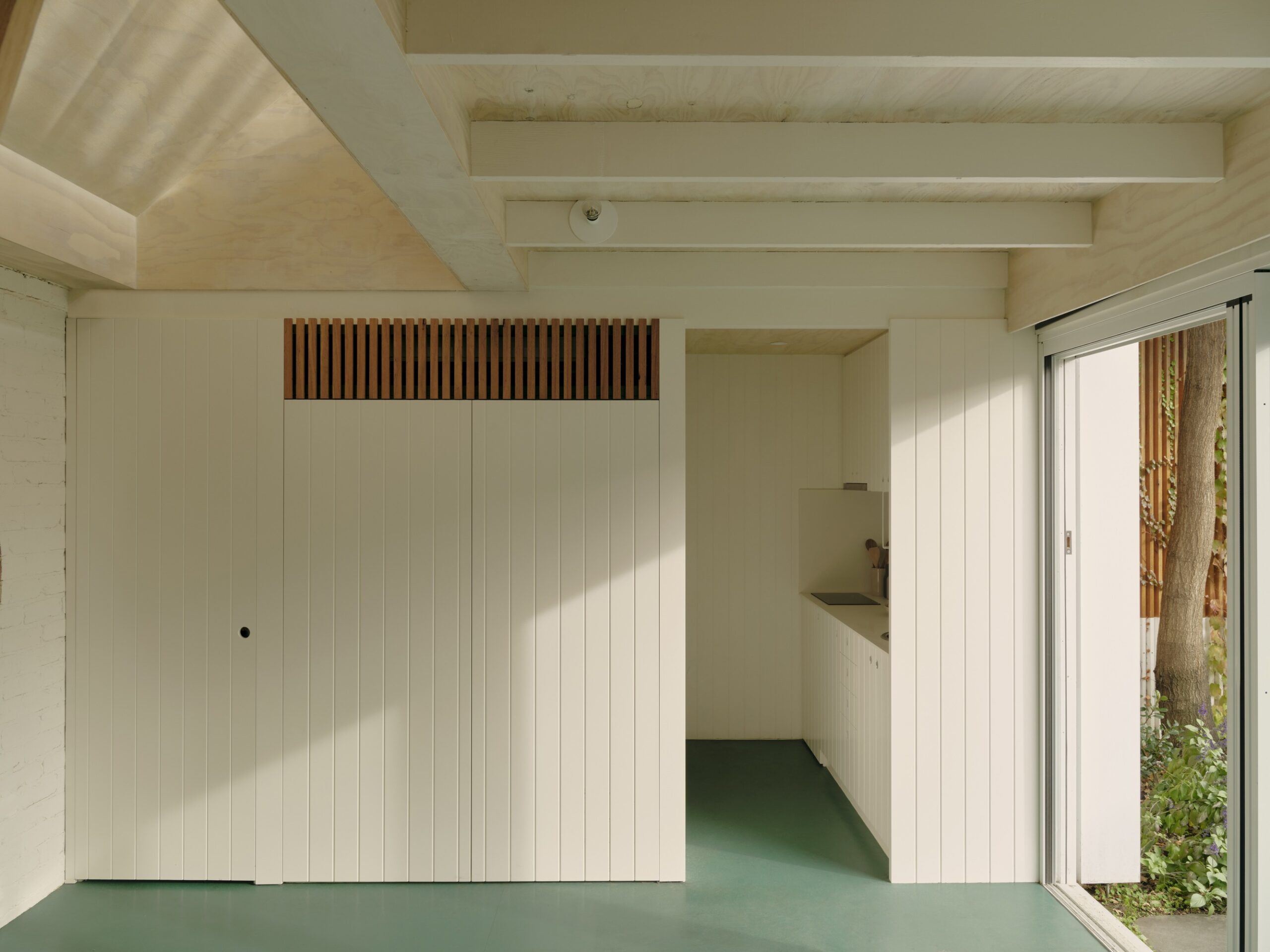 Chaque bâtiment est ainsi recouvert d’un grillage de frêne Silvertop de la manufacture Radial Timber, créant ainsi une vraie unité. Laissé brut au niveau des fenêtres, le bois est blanchi dans sa partie basse afin de fournir une toile de fond contrastée à la verdure du jardin.