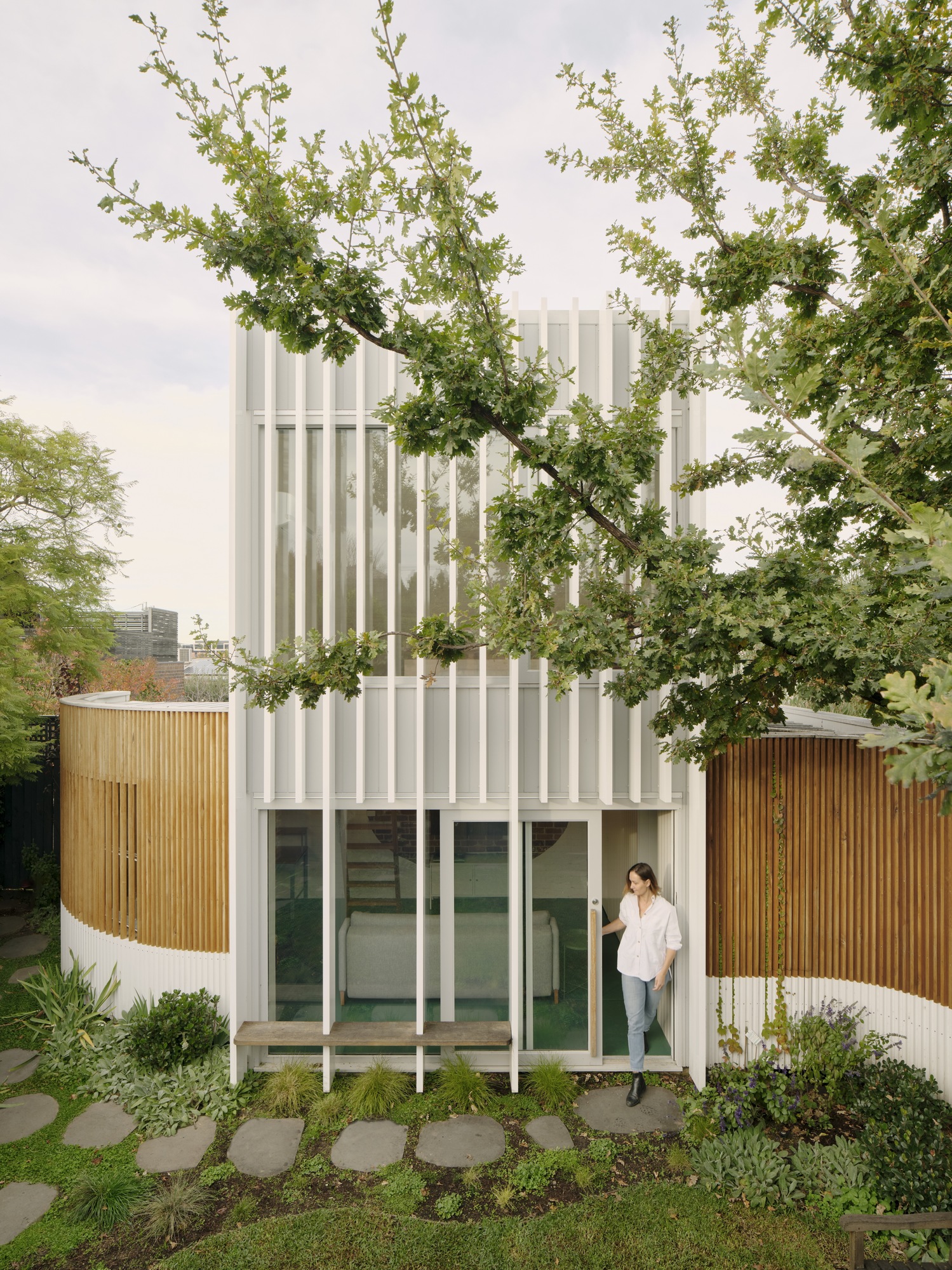 L’entrée principale par le jardin révèle instantanément l’harmonie entre la villa et le site de seulement 12×10 m.