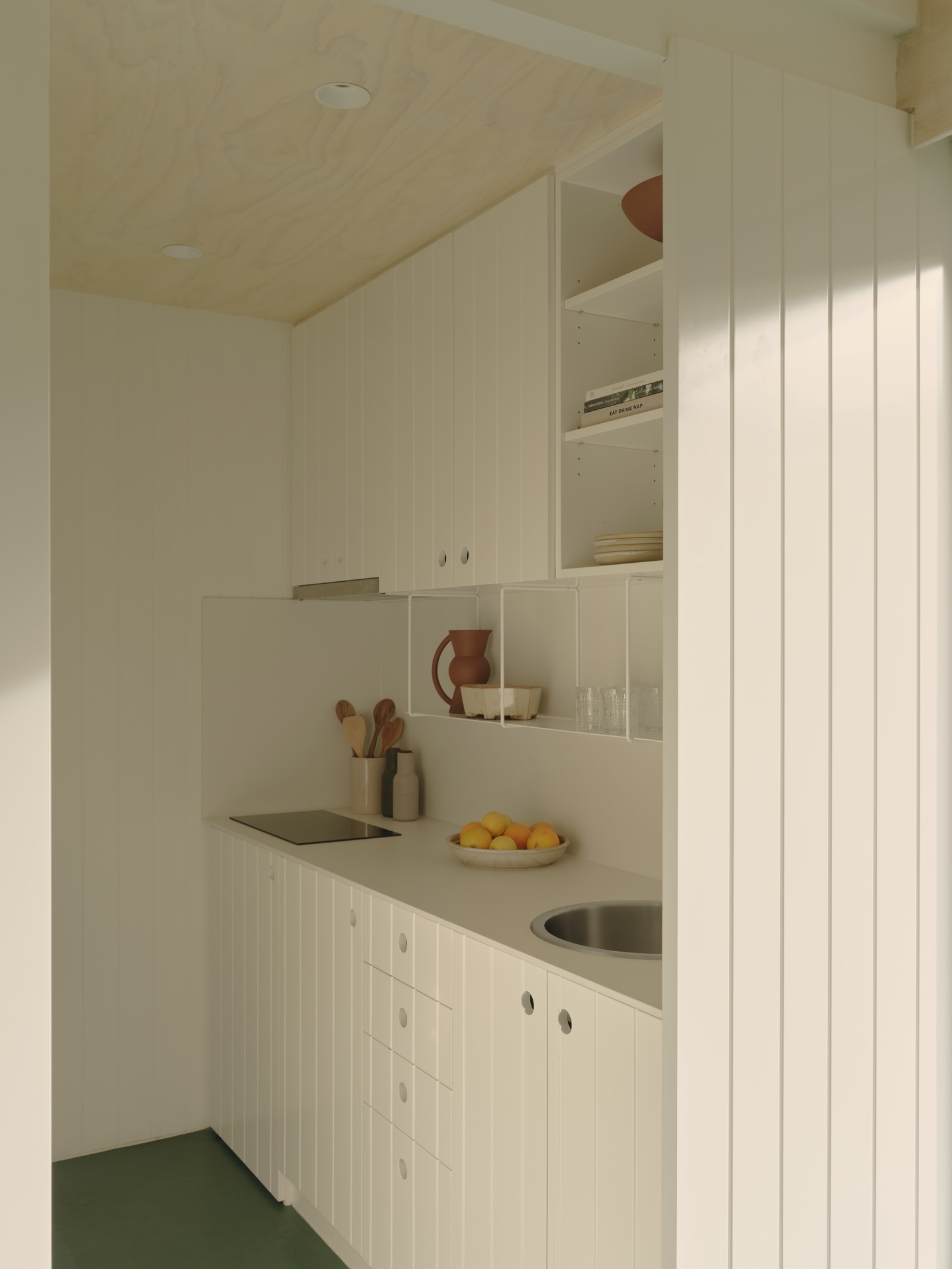 Alors que le mur du salon en contreplaqué est blanchi à la chaux et l’entièreté de la cuisine est peinte en Dulux “Natural White”…