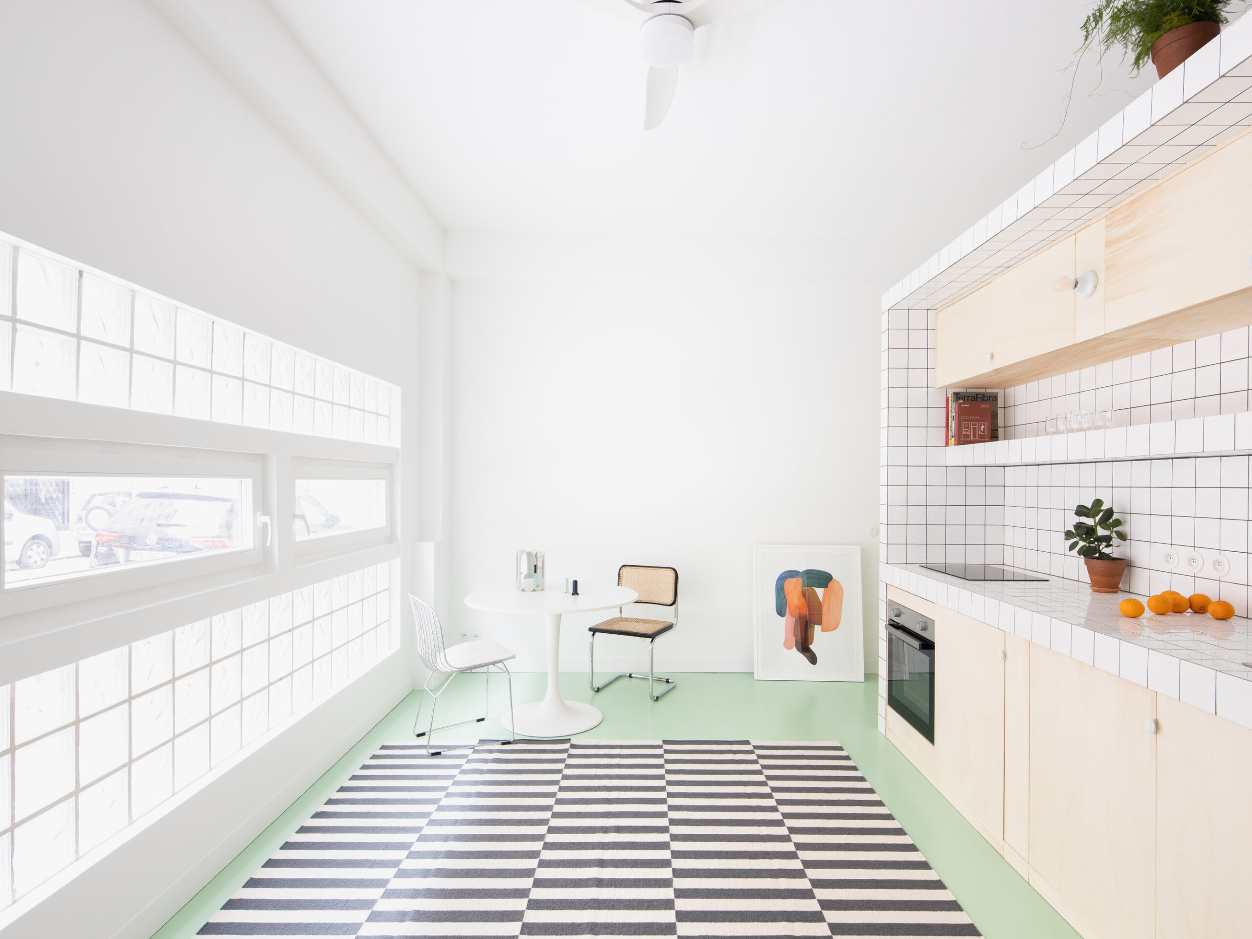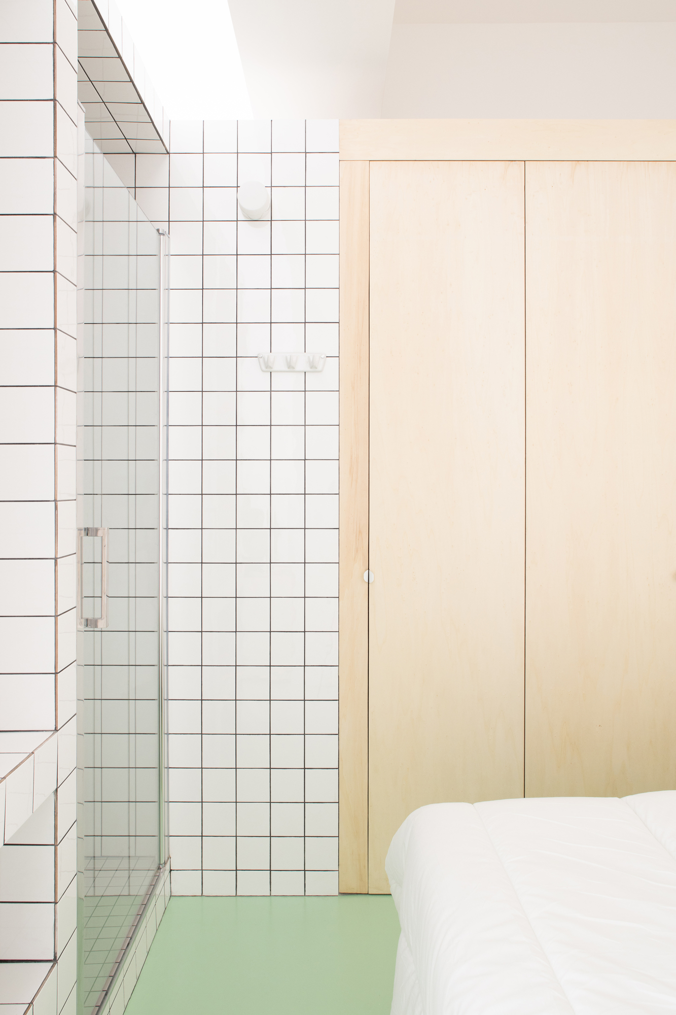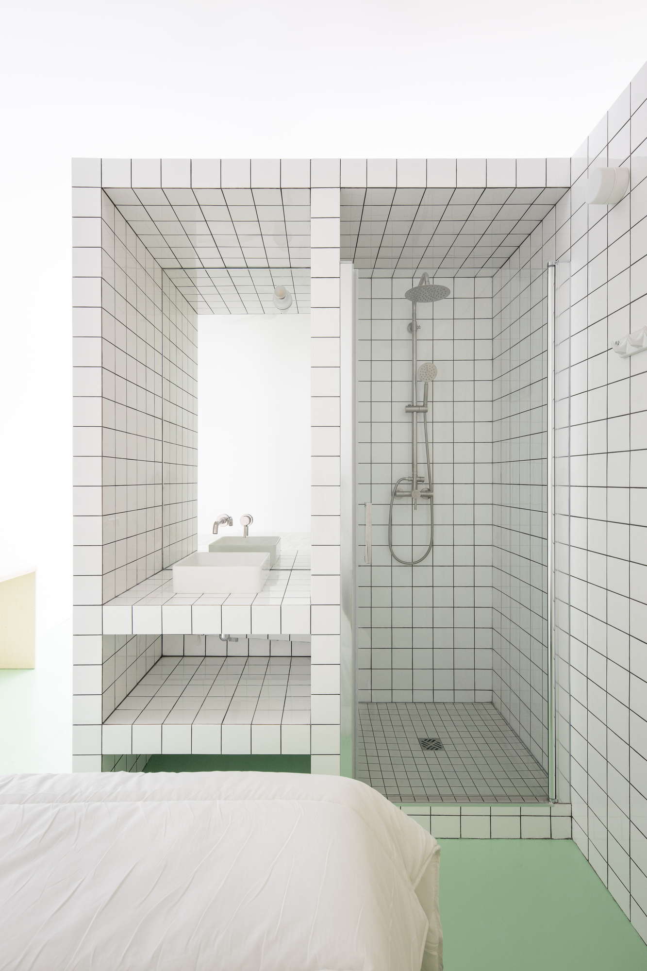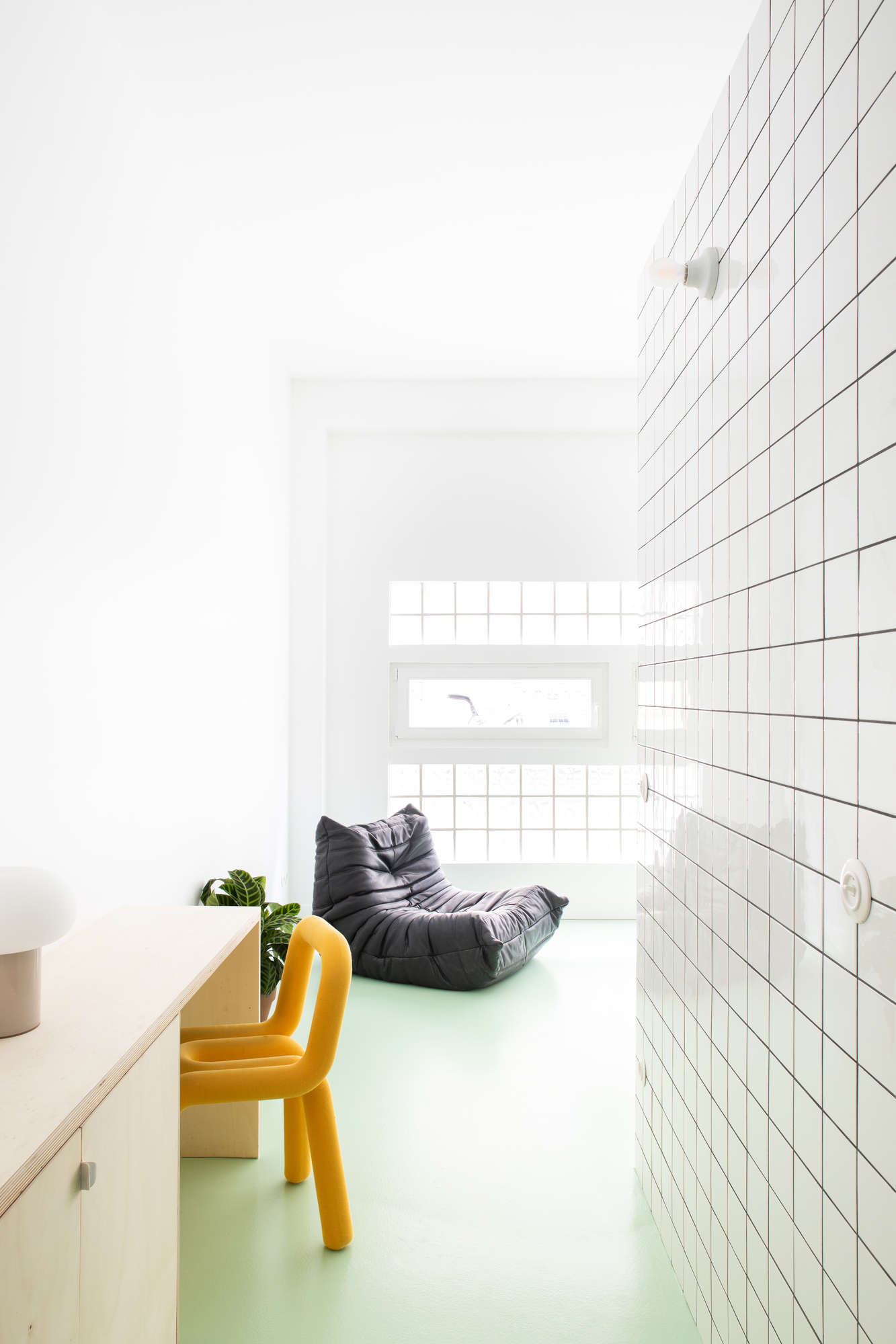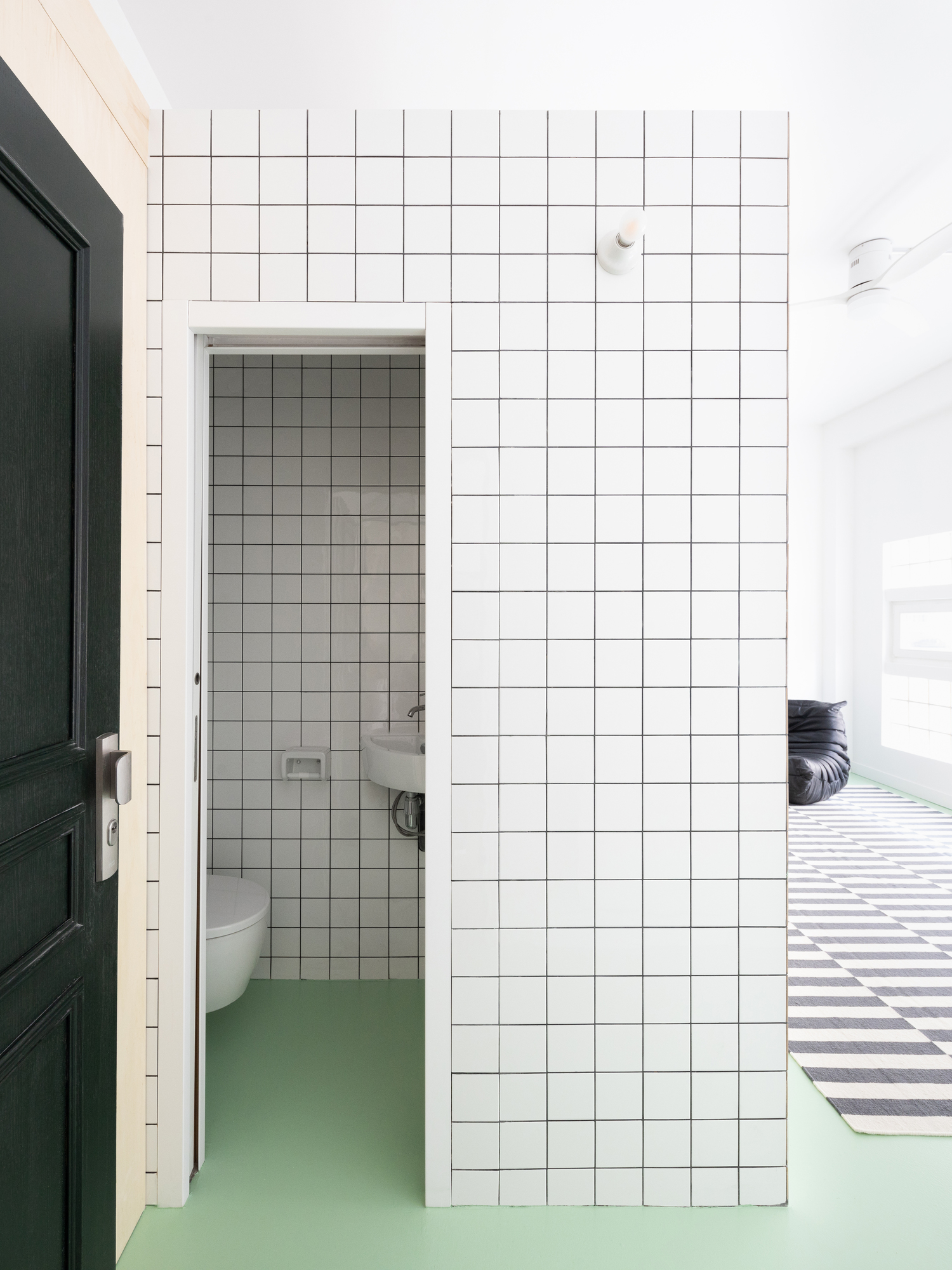 Le carrelage blanc associé au sol en époxy vert captent au maximum l’unique source de lumière.