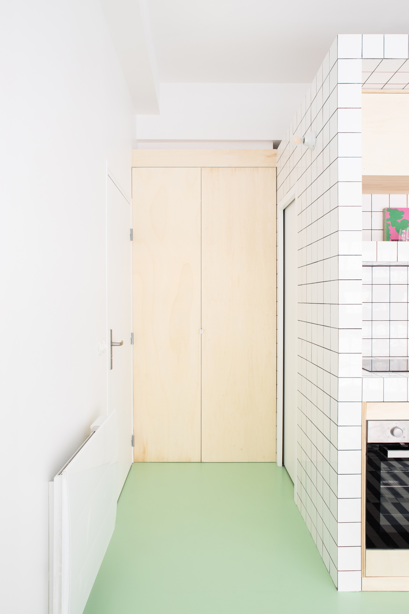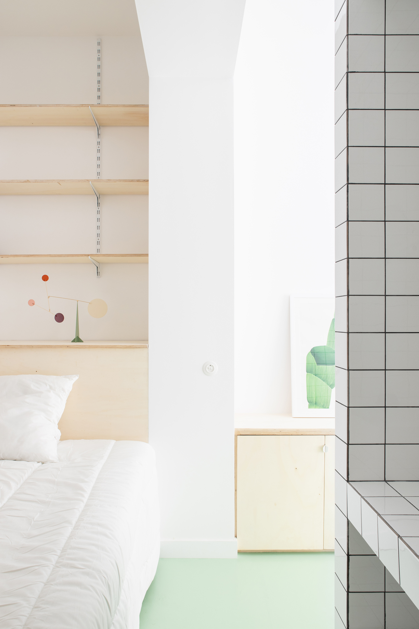 Les rangements ont été réalisés sur-mesure en contreplaqué peuplier.