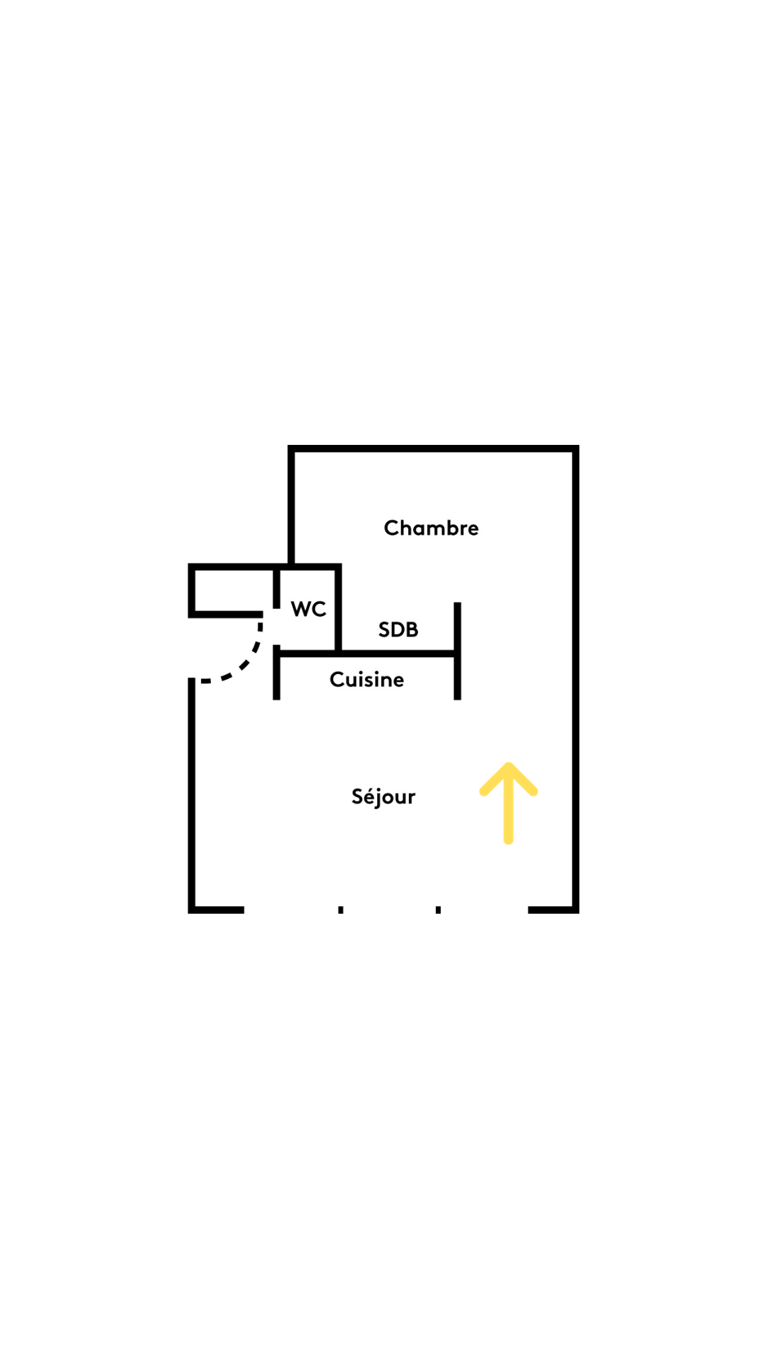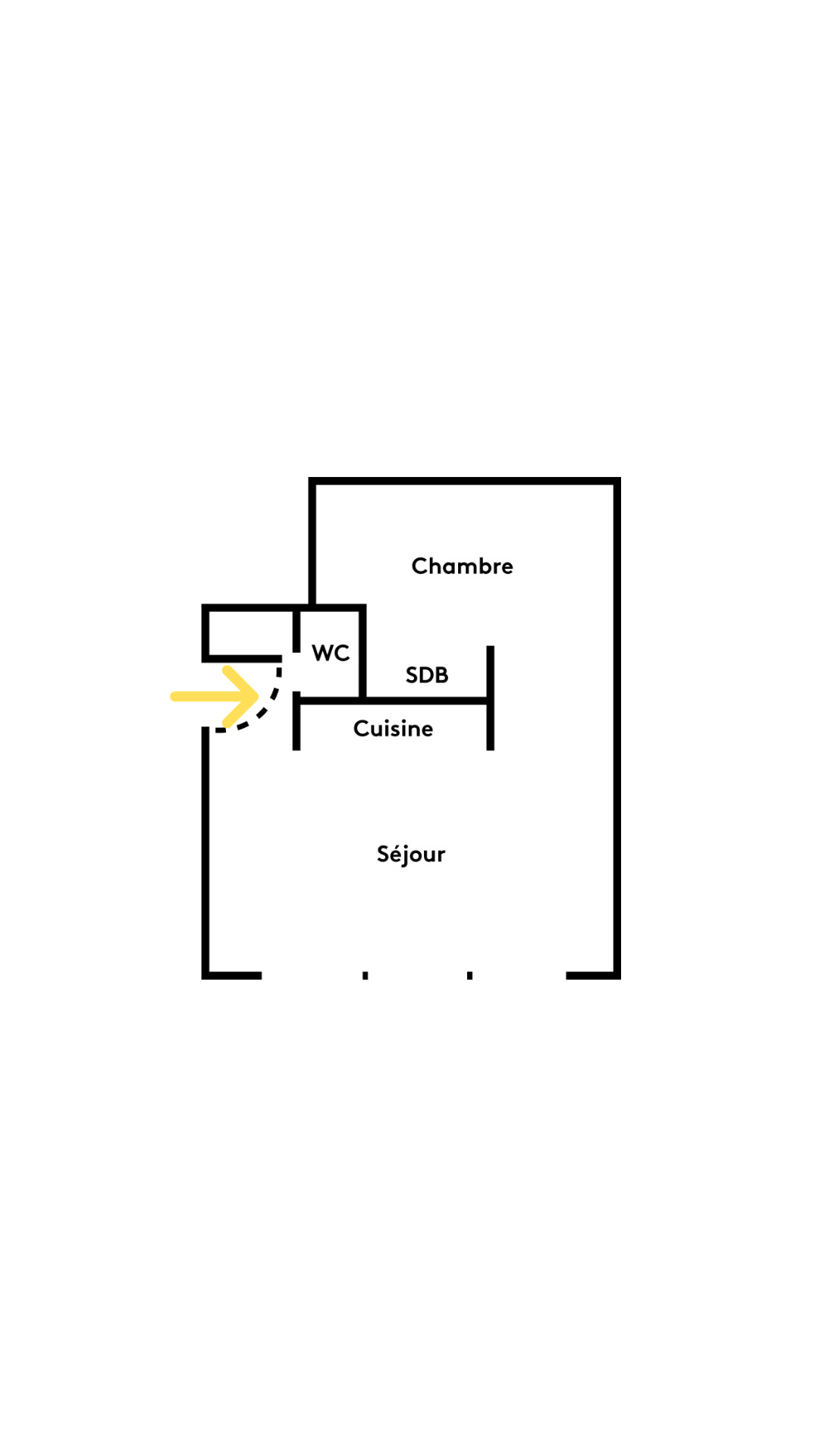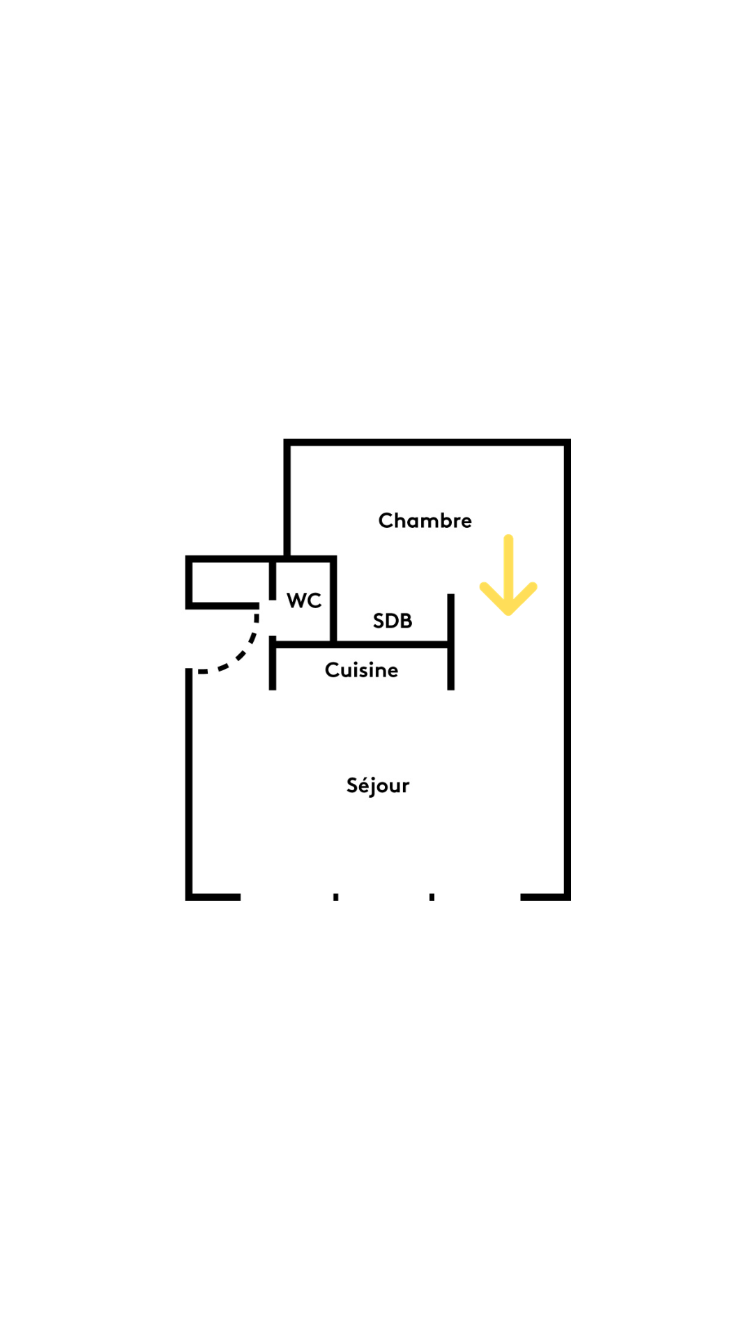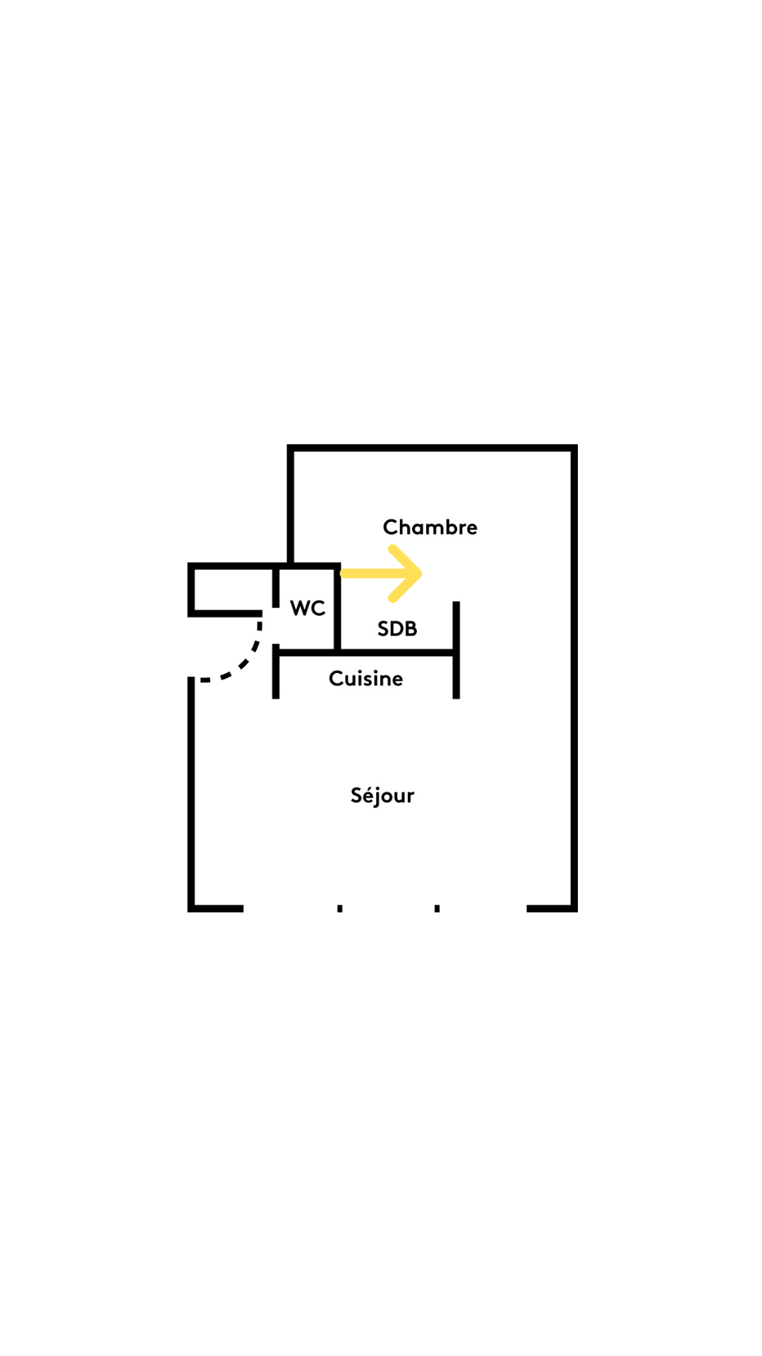 Direction la chambre, au fond de l’appartement. Toute la circulation se fait en périphérie du cube.