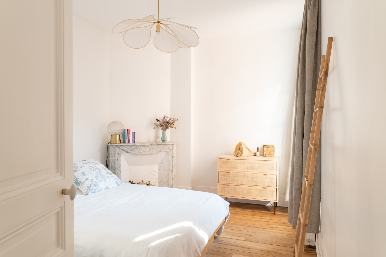 Dans la chambre, la traditionnelle cheminée en marbre côtoie des éléments en bois pour une ambiance chaleureuse.