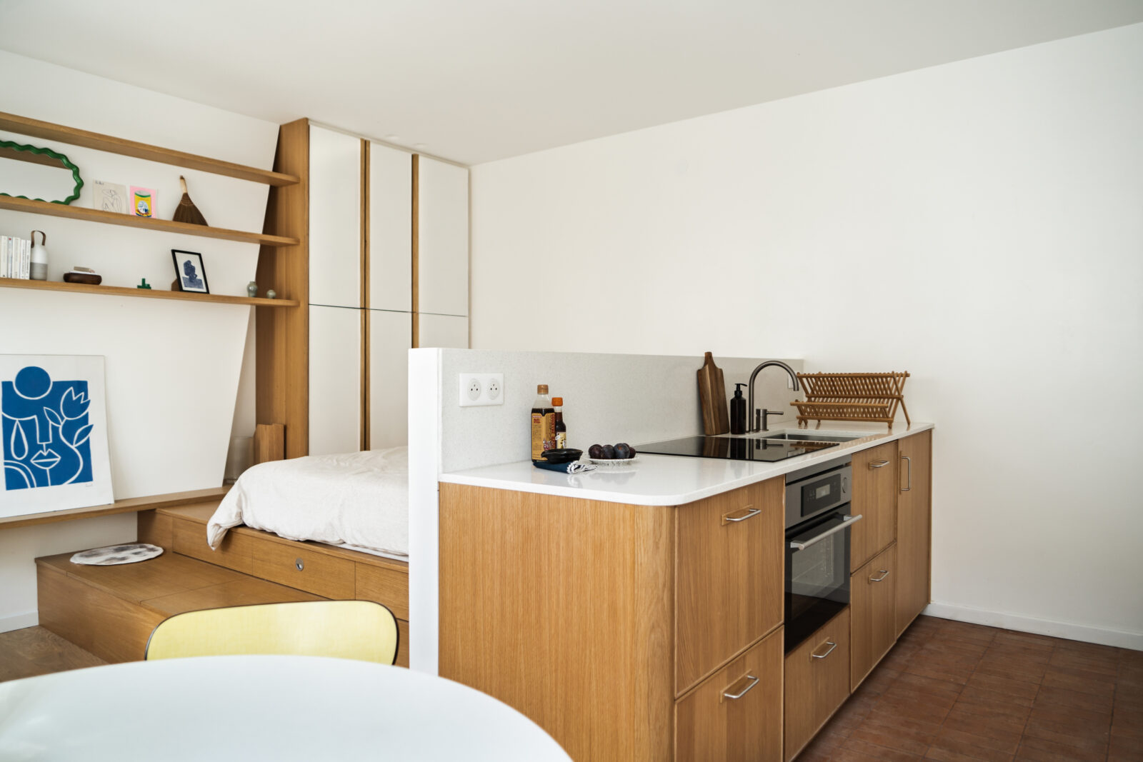 e arrondissement parisien. Sa nouvelle propriétaire, célibataire qui travaille dans une agence de design, souhaite y vivre à l’année, s’y ressourcer, recevoir… mais surtout exercer sa passion : la cuisine. Un cahier des charges ambitieux pour l’architecte d’intérieur qui s’empare du projet avec esprit et astuce. «