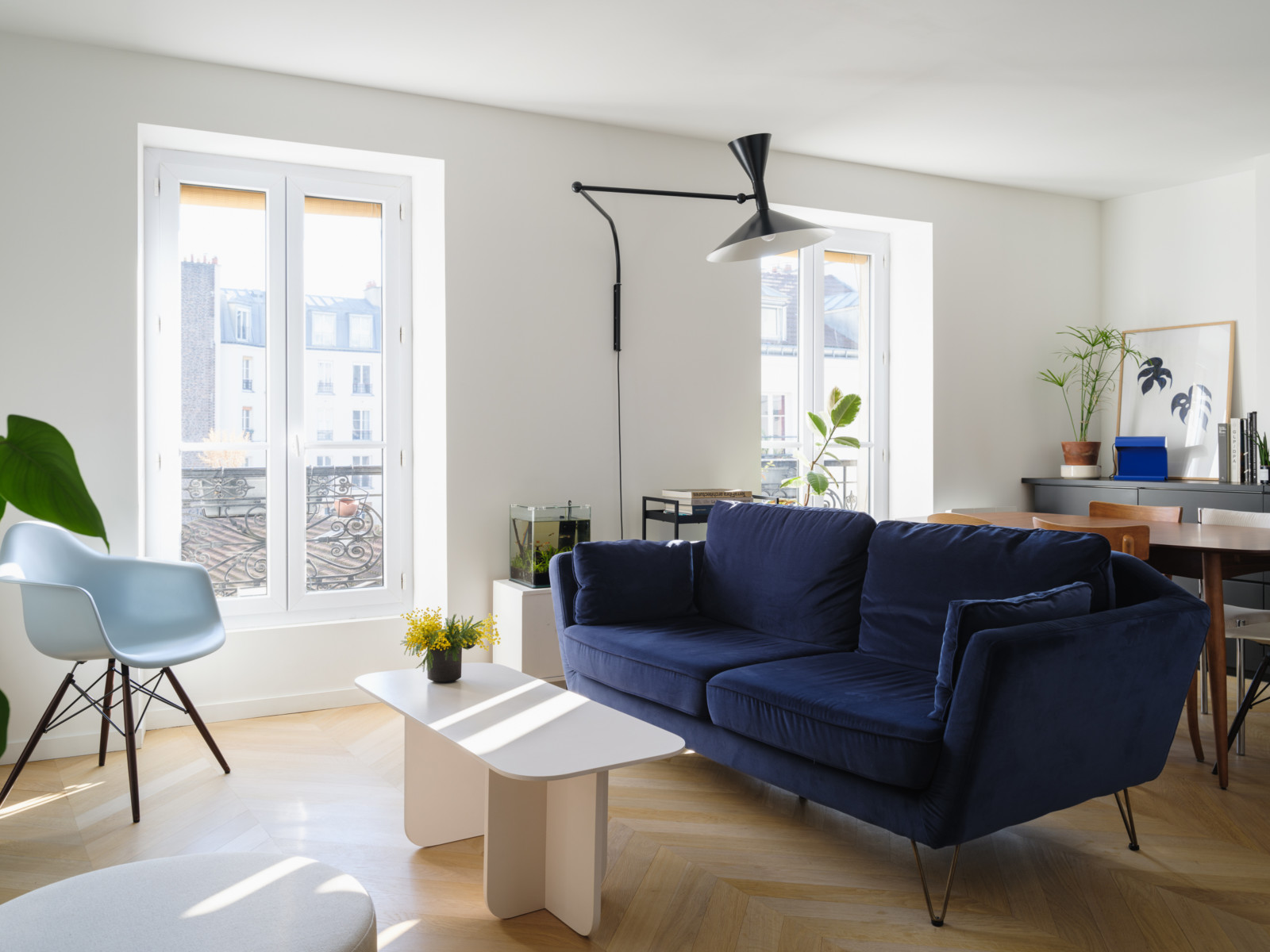 "On vit dans notre salon, c’est là qu’on passe le plus de temps et on adore recevoir des amis chez nous. On aime que chacun s’y sente bien." Séduits par la vue dégagée, avec la perspective de la rue en face, et la lumière qui entre à flots par les deux fenêtres plein sud, ils accentuent cette sensation de grand espace lumineux en jouant sur le côté traversant de l'appartement, grâce à la fenêtre de l’ancienne salle de bains, où prend place désormais la cuisine ouverte, au nord.