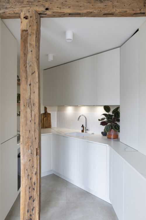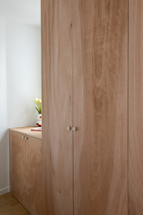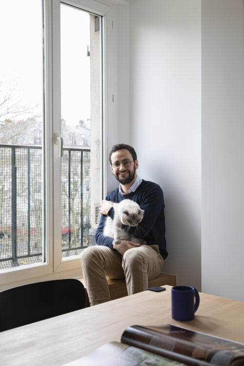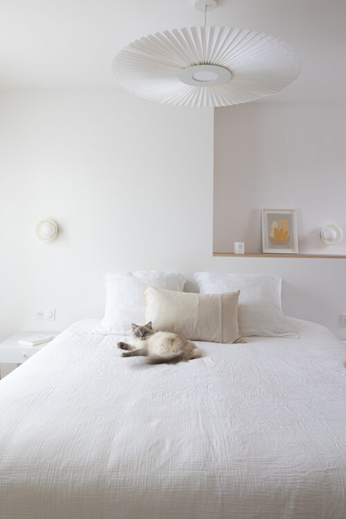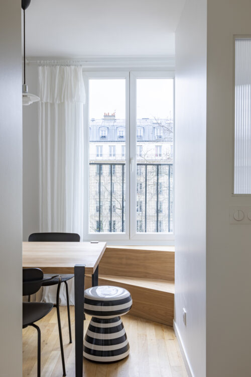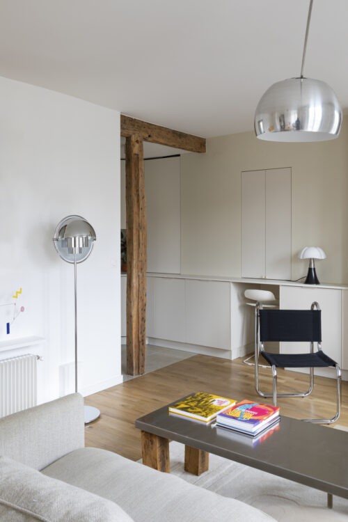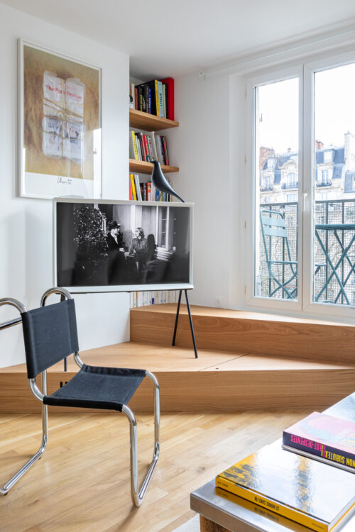 Alice Hervé de Ferron a eu à cœur de redéfinir chaque espace de l’appartement, de lui apporter du caractère et de gommer ses incongruités, tel l’accès au balcon, ce dernier surplombant jadis la pièce de vie de plusieurs dizaines de centimètres… Dotée désormais d’une paire d’escaliers symétriques qui y mène, la pièce a gagné en praticité comme en tempérament. Dans ses marches, qui servent d’assises d’appoint les soirs de fêtes, on range coussins et plaids. Ici, le chêne clair réchauffe les volumes, une poutre d’origine rappelle l’ADN séculaire de l’endroit. Le jaune, couleur totémique du couple, rebondit en divers points stratégiques. Les pièces techniques, volontairement compactes, sont un concentré d’ingéniosité où tout trouve sa place. Face à la salle d’eau, une buanderie a même été créée pour accueillir machines, manteaux, balais et croquettes du chat… “J’aime l’idée que nous puissions vivre longtemps dans ces murs, les faire évoluer ”, conclut Marie. Repère urbain avec vue sur les toits, ce très bel exercice de rationalisation laisse aussi la place à tous les imaginaires… Un cocon chaleureux, en somme, où l’optimisation ne l’emporte jamais sur le confort.
